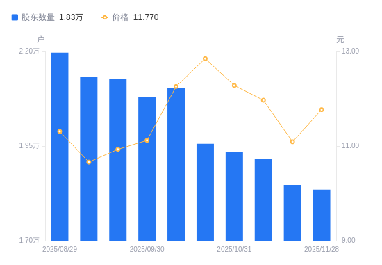 日期A股户数(户)流通A股户均持股数(股)户均持股市值(万元)2025-11-28183476883.298.102025-11-20184726836.717.582025-11-11191596591.567.892025-10-31193386530.558.022025-10-20195596456.768.302025-10-10210416001.997.362025-09-30207866075.626.762025-09-19212795934.856.492025-09-10213255922.056.312025-08-29219675748.986.50