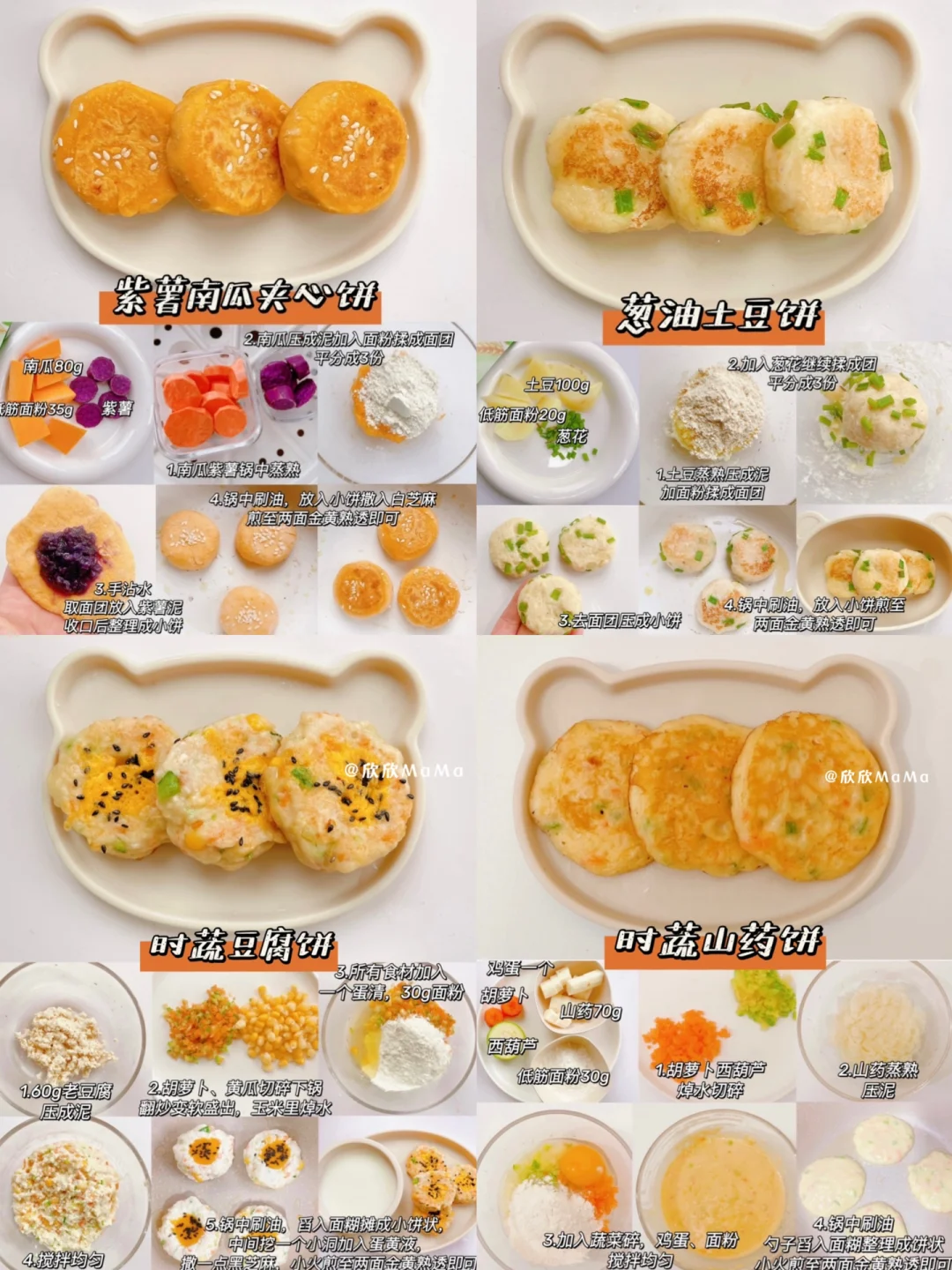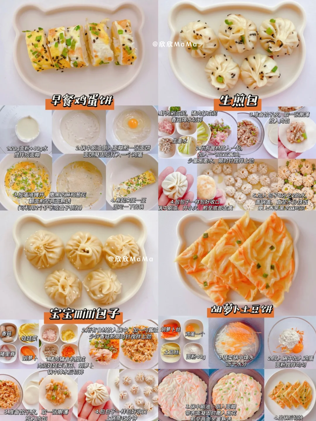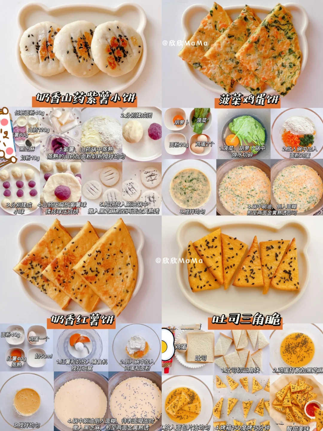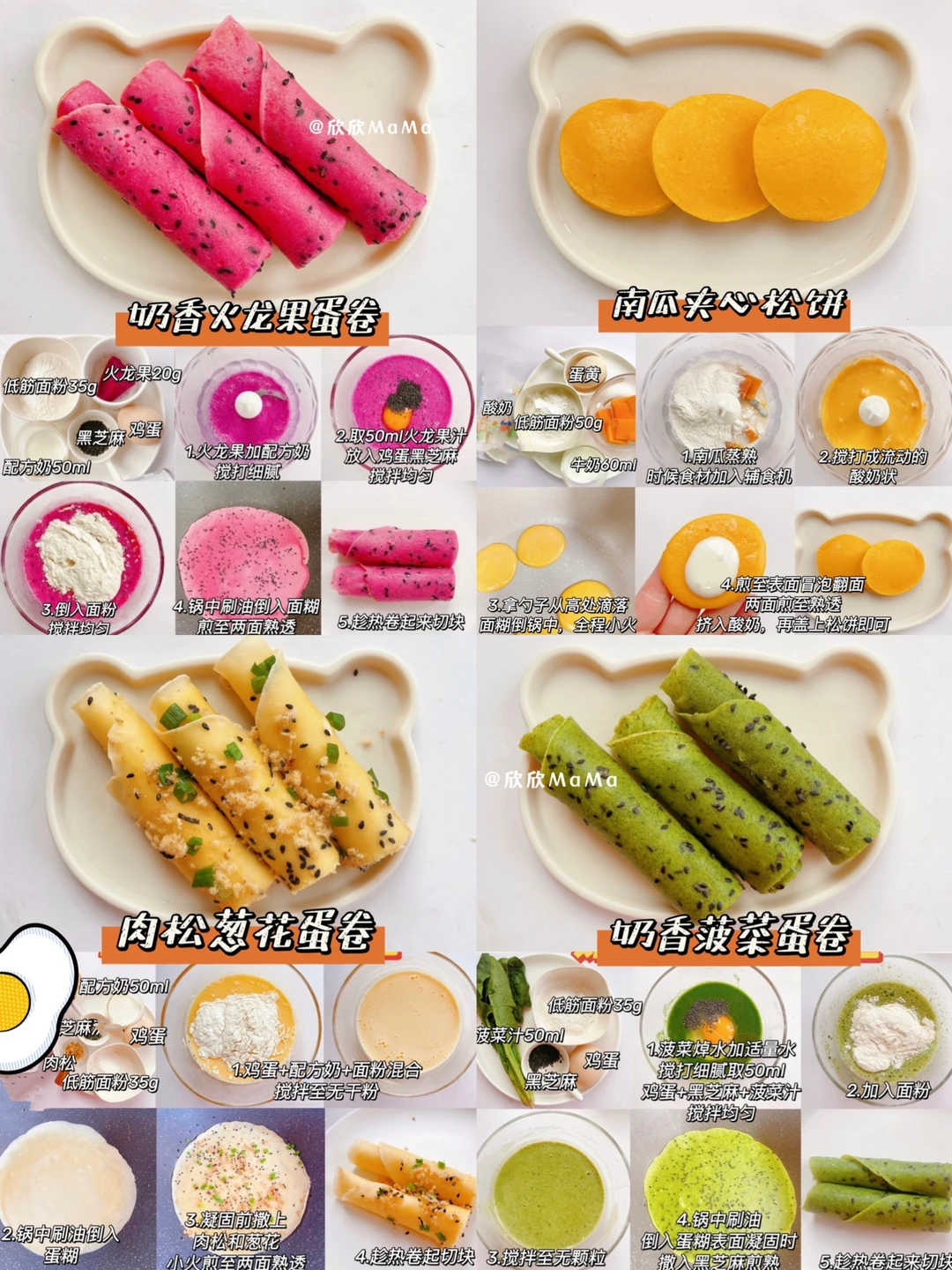 今天来分享一下平时给小欣欣做的24款简单易上手的美味早餐~有辅食小饼,鸡蛋饼~蛋卷~营养满满~每款味道都很不错,麻麻们赶紧和我一起做起来吧,总有一款合适你😋 适量给宝宝添加手指食物好处多多,可以锻炼宝宝的手部精细运动,提升咀嚼能力,增强自主进食意识。 〰️〰️ ✅南瓜夹心松饼(8m+) ✅吐司三角脆(12m+) ✅草莓西多士(12m+) ✅香蕉紫薯卷(12m+) ✅生煎包(12m+) ✅迷你包子(12m+) ✅酸奶小蛋糕(9m+) ✅火龙果蛋卷(9m+) ✅早餐鸡蛋饼(12m+) ✅胡萝卜土豆饼(12m+) ✅时蔬山药饼(9m+) ✅时蔬豆腐饼(9m+) ✅菠菜土豆卷(12m+) ✅菠菜猪肉蛋卷(12m+) ✅苹果鸡蛋饼(12m+) ✅菠菜鸡蛋饼(12m+) ✅肉松葱香蛋卷(8m+) ✅奶香菠菜蛋卷(8m+) ✅西红柿鸡蛋饼(12m+) ✅奶香红薯饼(12m+) ✅紫薯南瓜饼(10m+) ✅苹果山药饼(10m+) ✅葱油土豆饼(10m+) ✅山药紫薯小饼(10m+) . 妈妈们安排起来哦!