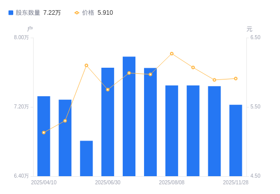 日期A股户数(户)流通A股户均持股数(股)户均持股市值(万元)2025-11-287224847522.3828.092025-09-307439246152.7727.182025-08-207448346096.3927.982025-08-087448146097.6328.902025-07-317650644877.4926.792025-07-187780644127.6726.432025-06-307652544866.3525.802025-05-306809550420.6530.762025-04-207283847137.4024.982025-04-107323346883.1624.05