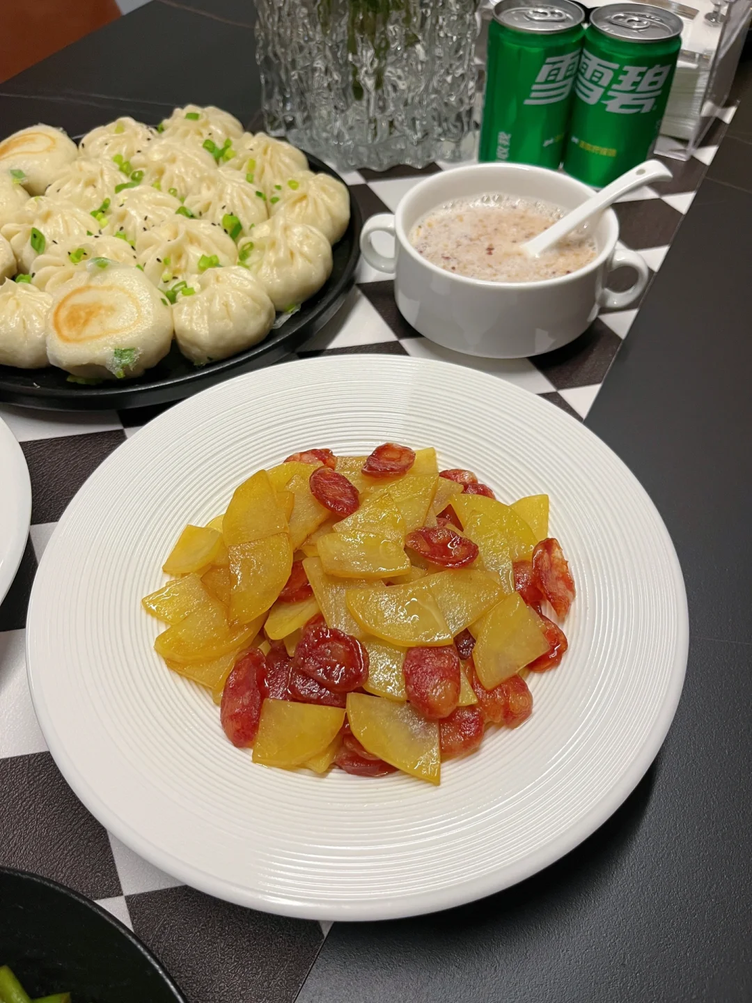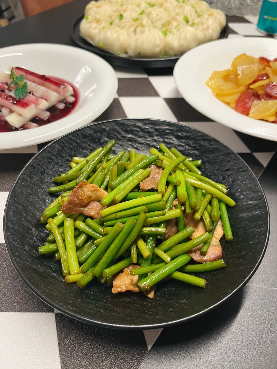 🥢水煎包:皮薄大馅不塌陷,这个虽然好久没做了,但是依然没有手生,我知道很多朋友都是通过这水煎包开始关注我的,教程可以翻一下之前的作品[偷笑R] 🥢蓝莓山药:最近真的很爱做这个小甜品,颜值高又好吃,酸甜开胃! 🥢腊肠炒士豆片:腊肠本身就是有咸味的,所以可以把土豆先炒熟最后放腊肠翻炒两下就可以装盘。 🥢蒜薹炒肉:超级下饭家常菜。 🥢燕麦粥:冲了两碗西澳阳光燕麦粥,甜甜的,我的最爱~