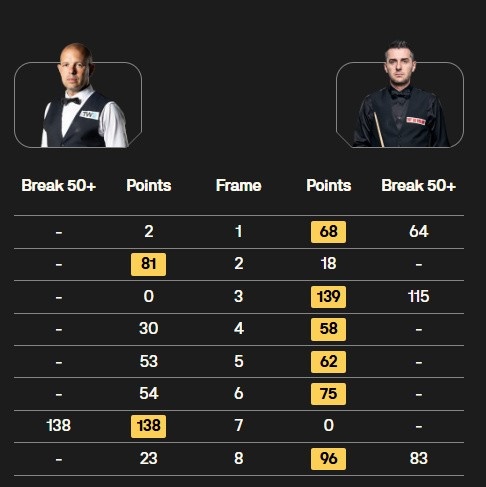 马克·塞尔比打出一杆破百(115)和两杆50+(64、83),巴里·霍金斯打出一杆破百(138),上半场过后塞尔比3-1领先霍金斯,下半场塞尔比5-1率先到达赛点,霍金斯打出单杆138分挽救赛点,最终马克·塞尔比6-2战胜巴里·霍金斯,晋级4强。