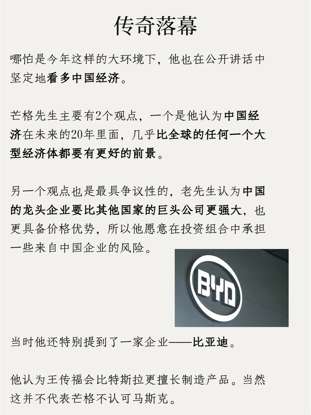芒格先生主要有2个观点,一个是他认为中国经济在未来的20年里面,几乎比全球的任何一个大型经济体都要有更好的前景。另一个观点也是最具争议性的,老先生任务中国的龙头企业要比其他国家的巨头公司更强大,也更具备价格优势,所以他愿意在投资组合中承担一些来自中国企业的风险。