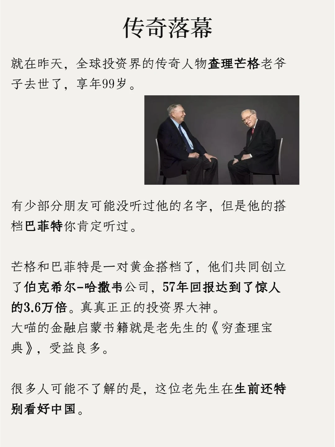 有少部分朋友可能没听过他的名字,但是他的搭档巴菲特你肯定听过,芒格和巴菲特是一对黄金搭档了,他们共同创立了伯克希尔-哈撒韦公司,57年回报达到了惊人的3.6万倍。真真正正的投资界大神,大喵的金融启蒙书籍就是老先生的《穷查理宝典》,受益良多。