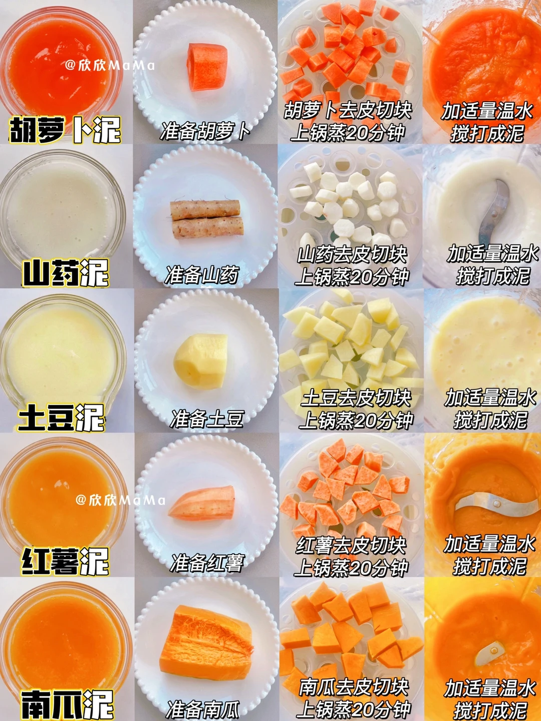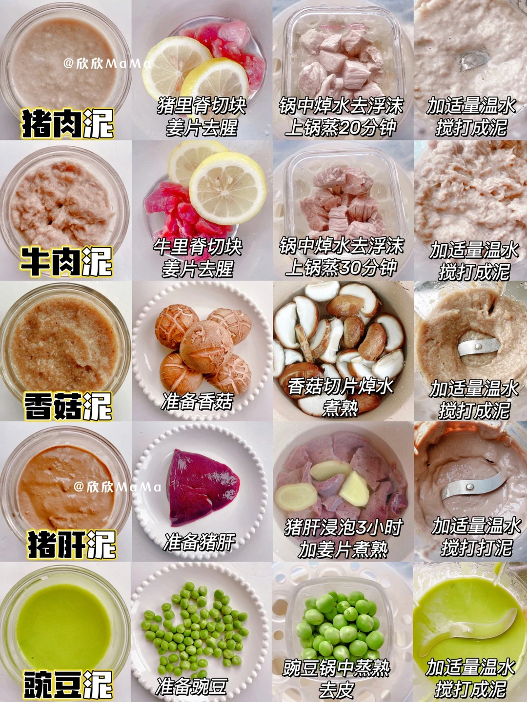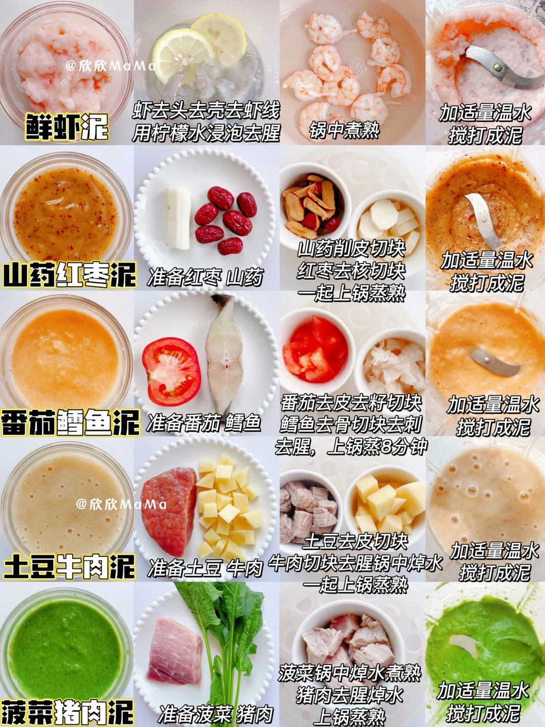 宝宝辅食什么时候添加? 食物的顺序是怎么样的? 如果你还不清楚,那就来看看这篇保姆级的辅食添加教程,希望整理的资料对你们有用! . 🔻米粉冲泡方法 宝宝第一口辅食应该选择高铁米粉 米粉冲泡步骤: 先倒50度温水到碗中,加入适量米粉, 静待30秒,用勺子顺时针搅拌均匀 . 🔻添加辅食顺序 宝宝添加高铁米粉一周后,就可以在辅食里添加蔬菜泥拉. 辅食泥第一天1-2勺,第2天2-3勺逐渐增加拌入米粉里,水果泥单独吃! . 🔻根茎泥 :吃米粉一周后开始添加 🛒食材:胡萝卜、土豆等 ‍做法:食材洗净削皮切小块,上蒸锅蒸20分钟,加入适量温水辅食机搅打泥少量拌入米粉里 . 🔻蔬菜泥 :吃3-4种根茎泥后 🛒食材:西兰花、菠菜等 ‍做法:食材洗净锅中焯水煮熟,加适量温水辅食机搅打呈泥少量拌入米粉里 . 🔻水果泥 :添加辅食半个月后,安排在午睡后吃 🛒食材:苹果、香蕉等 ‍做法:直接刮泥勺刮出泥或削皮切块辅食机搅打呈泥 🔸我是宝宝开始吃混合果泥后直接入的小皮果泥,因为她是欧盟有机农场食材,配料表很干净,只有蔬菜或水果,其他没了,口感酸酸甜甜的;每袋都有1-5种食材,能够帮助宝宝补充多种维生素,也不容易出现偏食,四层锁鲜包装,不添加防腐剂也能保鲜,外出携带也很方便! . 🔻鱼肉泥 :7-8月逐渐增加 🛒食材:鸡肉、猪肉、鱼肉、牛肉 ‍做法:食材洗净去腥,锅中焯水去浮沫,上蒸锅蒸20分钟加适量温水辅食机搅打呈泥少量拌入米粉里滴入核桃油 7个月宝宝辅食|8个月宝宝辅食|9个月宝宝辅食|10个月宝宝辅食|1岁宝宝辅食