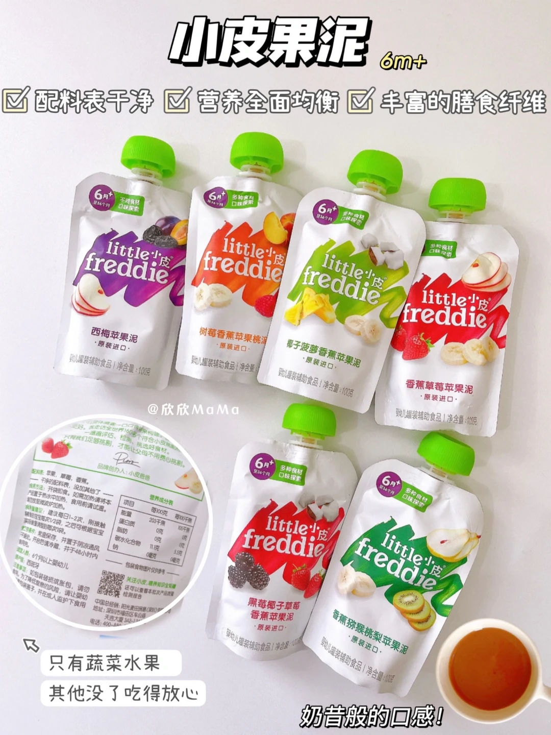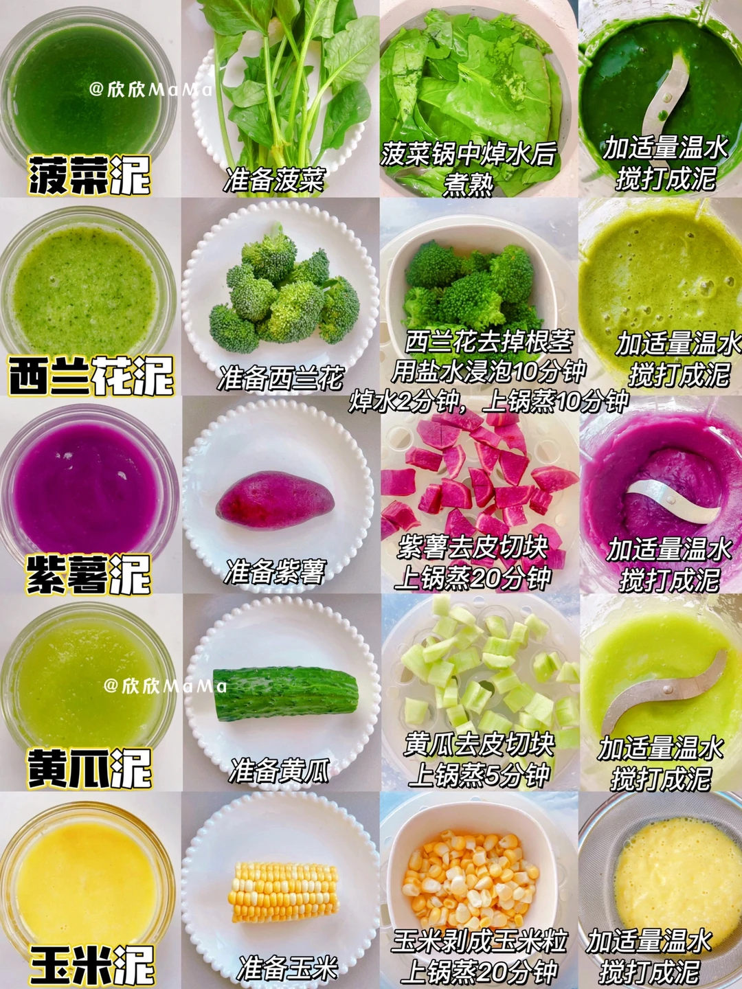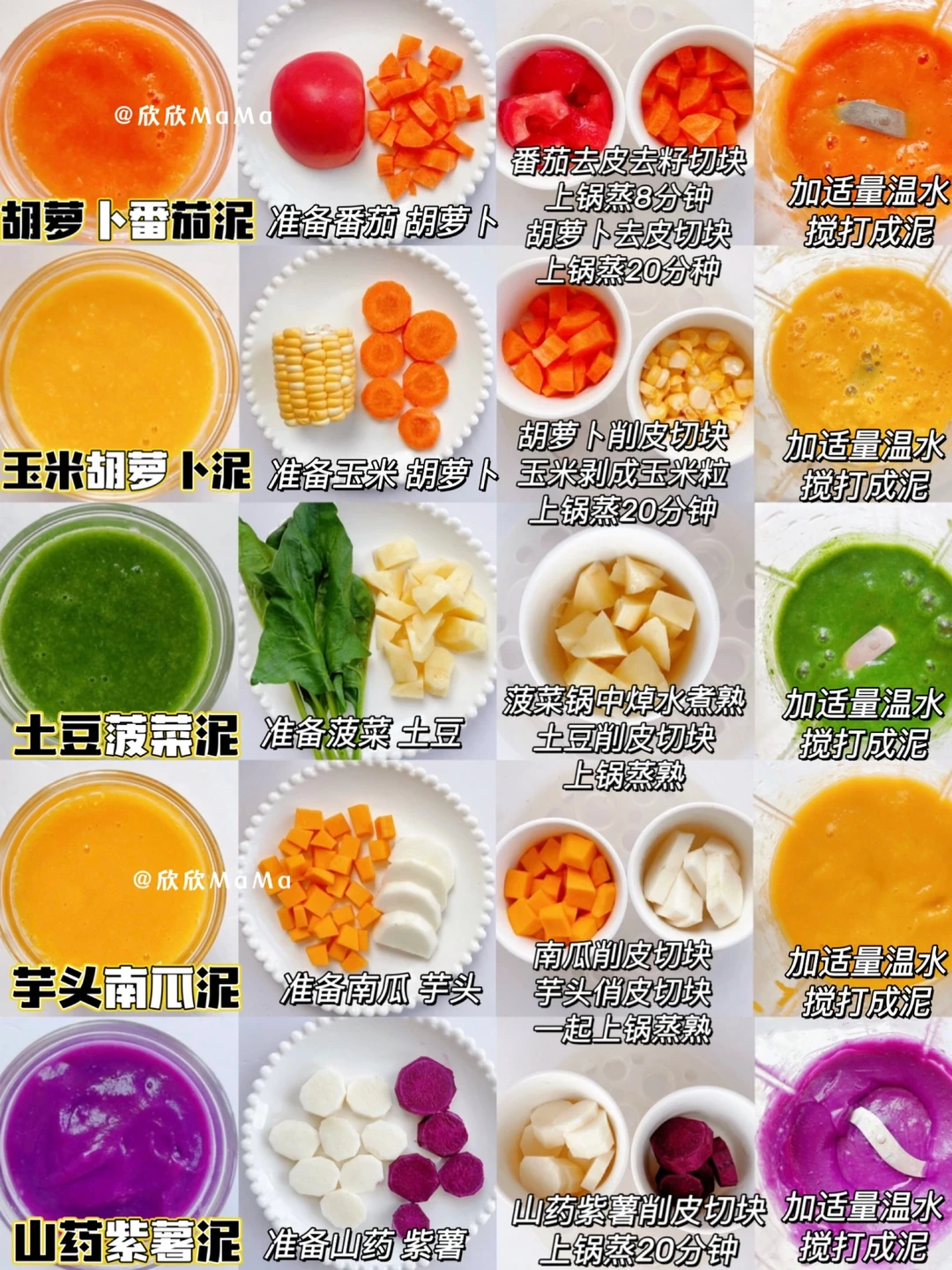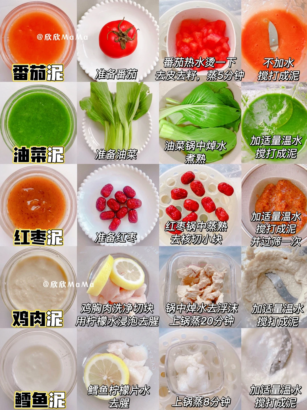宝宝辅食什么时候添加? 食物的顺序是怎么样的? 如果你还不清楚,那就来看看这篇保姆级的辅食添加教程,希望整理的资料对你们有用! . 🔻米粉冲泡方法 宝宝第一口辅食应该选择高铁米粉 米粉冲泡步骤: 先倒50度温水到碗中,加入适量米粉, 静待30秒,用勺子顺时针搅拌均匀 . 🔻添加辅食顺序 宝宝添加高铁米粉一周后,就可以在辅食里添加蔬菜泥拉. 辅食泥第一天1-2勺,第2天2-3勺逐渐增加拌入米粉里,水果泥单独吃! . 🔻根茎泥 :吃米粉一周后开始添加 🛒食材:胡萝卜、土豆等 ‍做法:食材洗净削皮切小块,上蒸锅蒸20分钟,加入适量温水辅食机搅打泥少量拌入米粉里 . 🔻蔬菜泥 :吃3-4种根茎泥后 🛒食材:西兰花、菠菜等 ‍做法:食材洗净锅中焯水煮熟,加适量温水辅食机搅打呈泥少量拌入米粉里 . 🔻水果泥 :添加辅食半个月后,安排在午睡后吃 🛒食材:苹果、香蕉等 ‍做法:直接刮泥勺刮出泥或削皮切块辅食机搅打呈泥 🔸我是宝宝开始吃混合果泥后直接入的小皮果泥,因为她是欧盟有机农场食材,配料表很干净,只有蔬菜或水果,其他没了,口感酸酸甜甜的;每袋都有1-5种食材,能够帮助宝宝补充多种维生素,也不容易出现偏食,四层锁鲜包装,不添加防腐剂也能保鲜,外出携带也很方便! . 🔻鱼肉泥 :7-8月逐渐增加 🛒食材:鸡肉、猪肉、鱼肉、牛肉 ‍做法:食材洗净去腥,锅中焯水去浮沫,上蒸锅蒸20分钟加适量温水辅食机搅打呈泥少量拌入米粉里滴入核桃油 7个月宝宝辅食|8个月宝宝辅食|9个月宝宝辅食|10个月宝宝辅食|1岁宝宝辅食