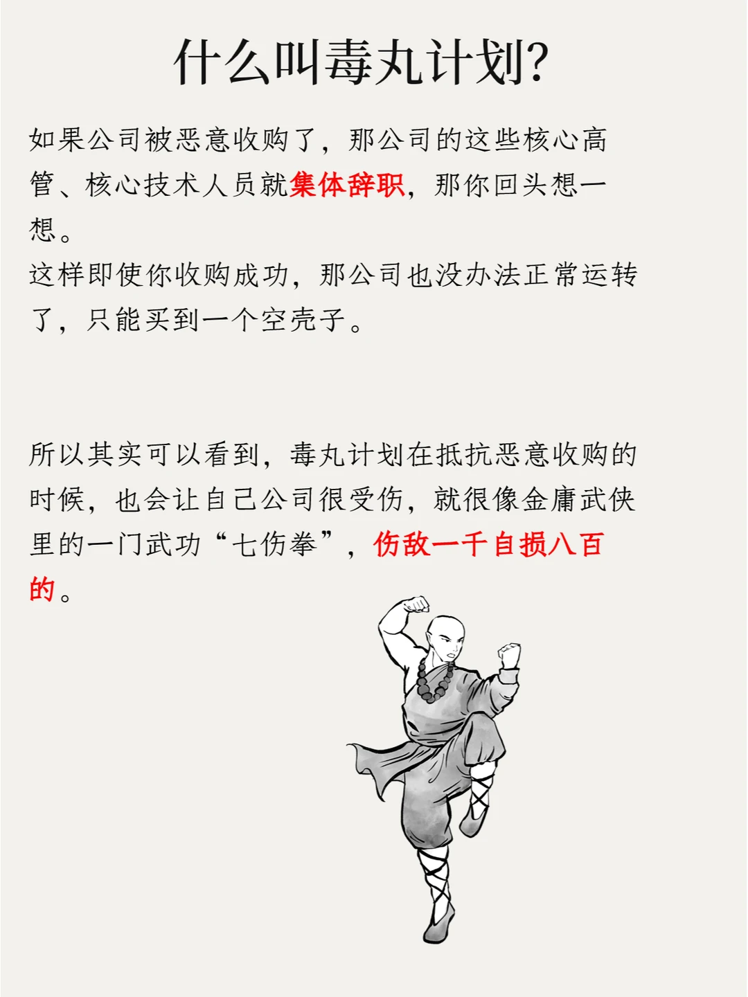 所以其实可以看到,毒丸计划在抵抗恶意收购的时候,也会让自己公司很受伤,就很像金庸武侠里的一门武功“七伤拳”,伤敌一千自损八百的。