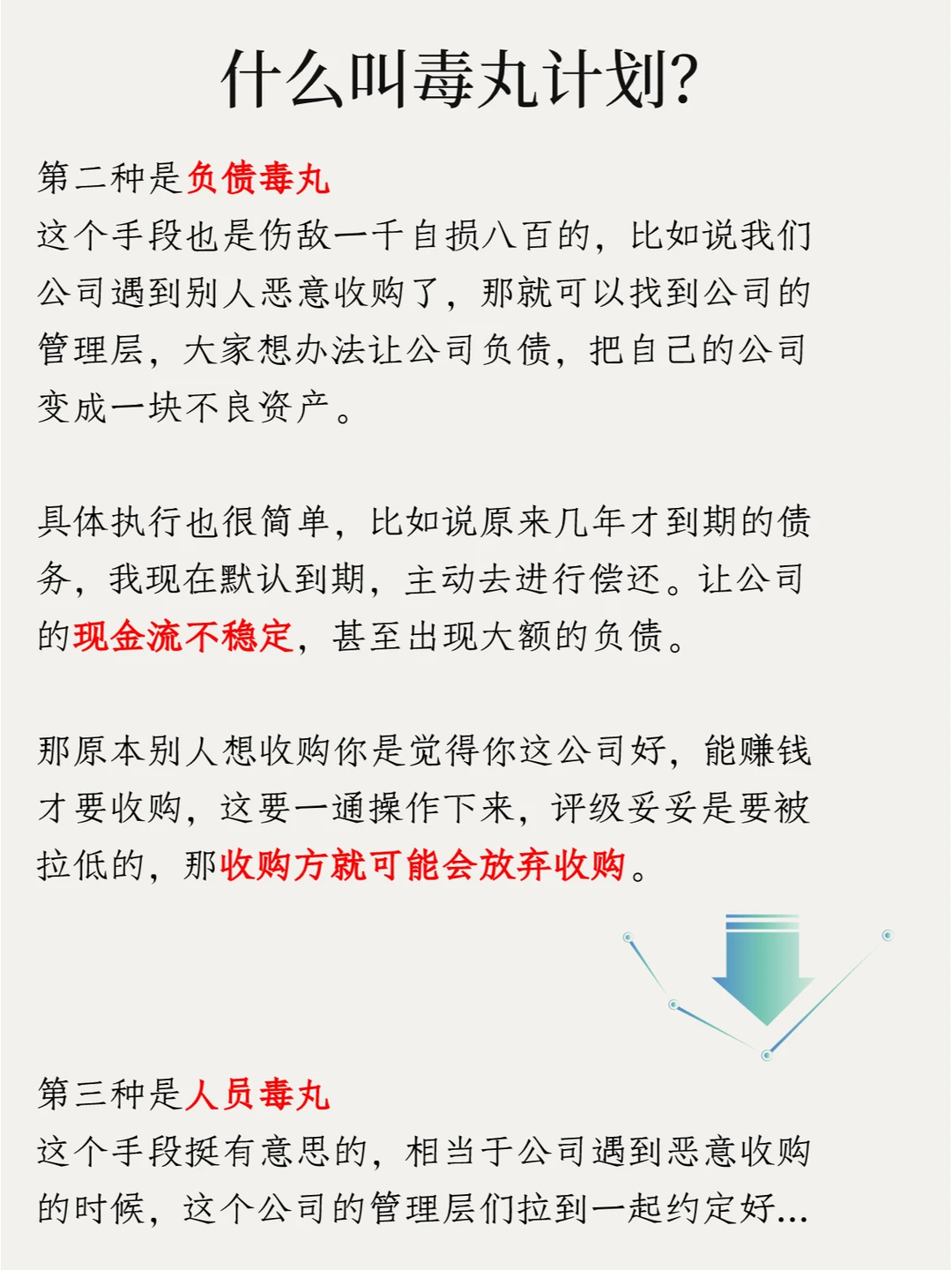 第二种是负债毒丸,这个手段也是伤敌一千自损八百的,比如说我们公司遇到别人恶意收购了,那就可以找到公司的管理层,大家想办法让公司负债,把自己的公司变成一块不良资产。