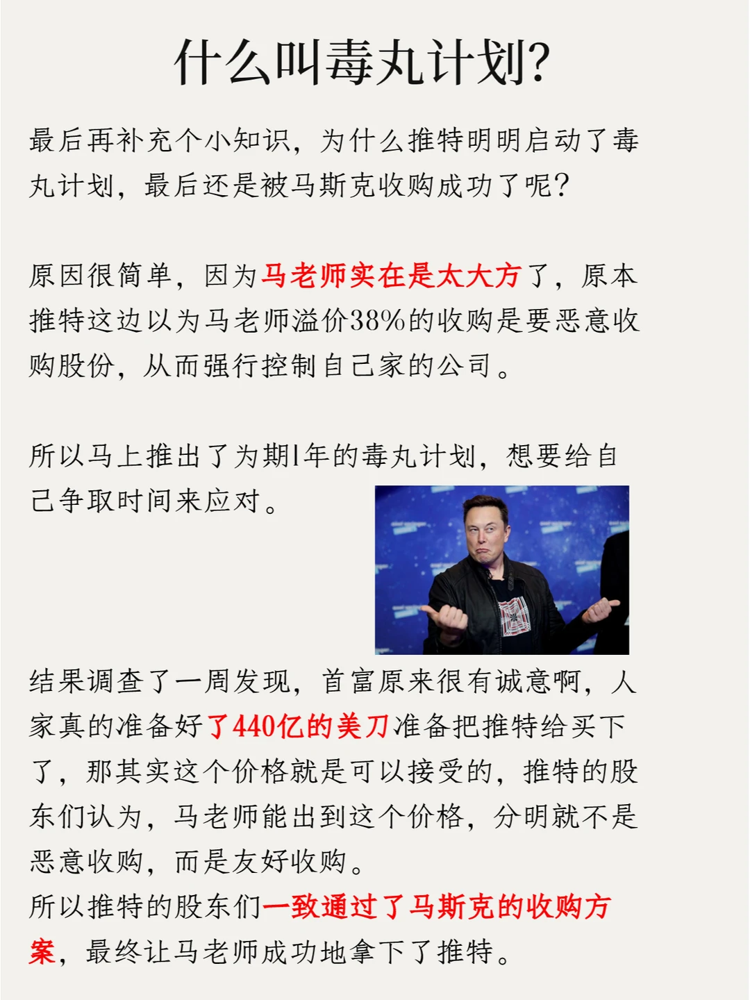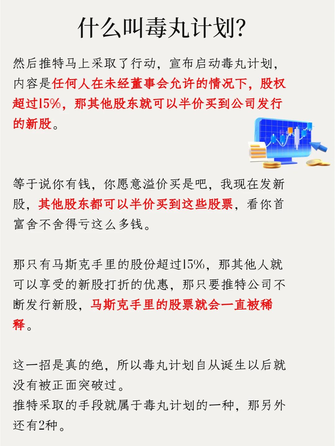 然后推特马上采取了行动,宣布启动毒丸计划,内容是任何人在未经董事会允许的情况下,股权超过15%,那其他股东就可以半价买到公司发行的新股。