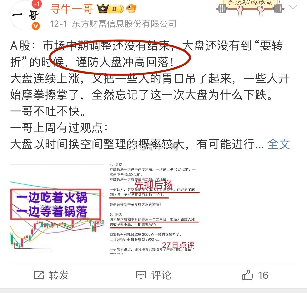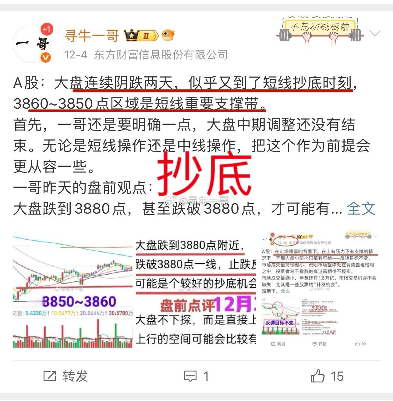 A股:政策利好可能改变大盘中期调整的节奏,但难以从根本上改变市场趋势。下周谨防冲高回落!1,本周预测可以打90分本周市场从发展到结果,基本上与一哥在11月30日的预测一致。12月1日,开盘前提示大盘可能回落。12月4日,开盘前提示到了抄底时刻。本周最高点是12月1日的3914点,本周最低点是12月4日的3859点。卖在高区,买在低区,高抛低吸,从短线操作层面来说,可以说是比较成功的。“10分”的意外,来自于周五下午金融板块的拉升。这种政策性利好,不是我等散户可以提前预知的。2,理性看待利好对市场的影响保险公司调整投资“相关股票”的风险因子,券商提高杠杆。这些政策举措都在释放资金,长期来说,对市场是利好无疑。长期利好并不代表短期市场会疯涨,一哥理解这是为了“稳住”市场预期。有些人说大盘要复刻2015年行情,这是一厢情愿。实际上,市场走到目前,与2020年下半年的行情倒是颇为相似。都是大盘经过了快速上涨之后,进入到了震荡调整周期。一哥讲过,即使大盘在某个时刻或某个短周期发飙,也难以彻底摆脱这个震荡调整趋势。目前市场总体市值100多万亿,市场整体趋势不是一个利好就能够在短期内改变的。3,下周市场展望创业板从3331点(10月30日)跌到了2892点(11月24日),跌了13%。又从2892点反弹到3115点(12月5日),上涨了7.7%。反弹幅度接近了一半,短期内,创业板顶多再向3200点靠拢一些,但攻上去甚至站稳难度不小。深成指与创业板指相似。与深成指相比,上证综指落后了一些。深成指本周已经摸到了MA20/30均线,上证综指距离MA20/30均线还有一点距离。目前上证综指MA20/30均线位于3930~3940点区域。PS:一哥前一周预期的反弹目标也就是MA20/30均线区域。下周大盘阻力区域,在3930~3940点区域。再牛一点,攻击3950~3960点区域。预计下周整体走势与这一周相似,好一点就是小阳,差一点就是小阴。市场成交量缩小,短线并不好把握……个人观点,仅供交流,不构成投资建议!理财有风险,投资需谨慎!A股股市分析A股行情A股市场今日看盘a股