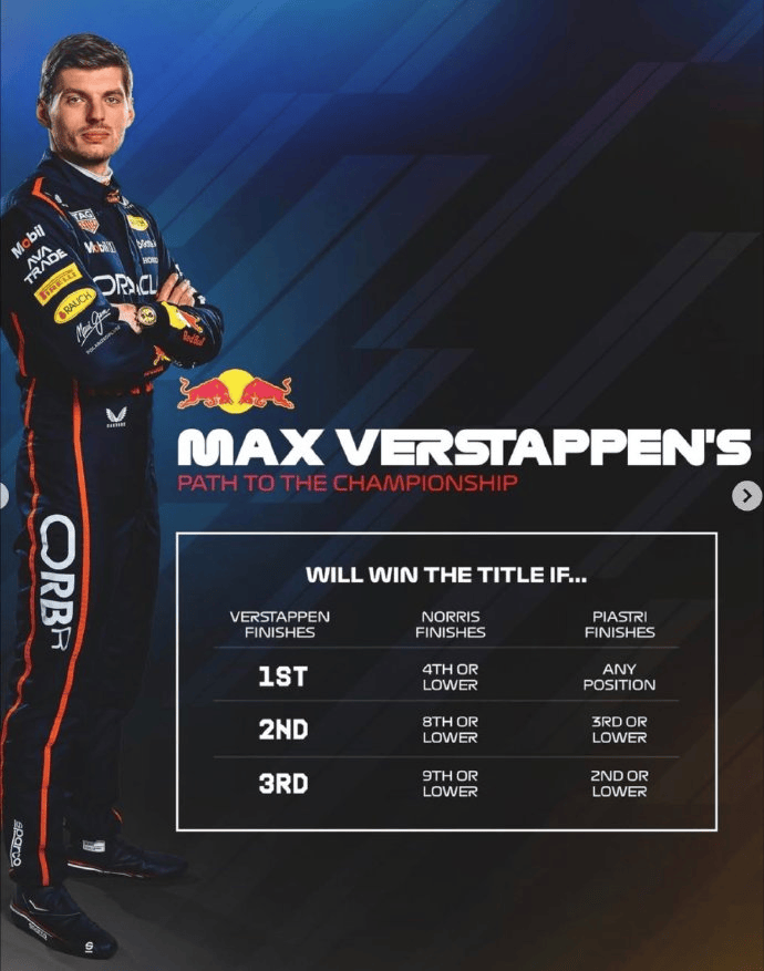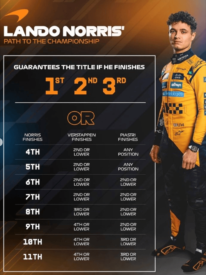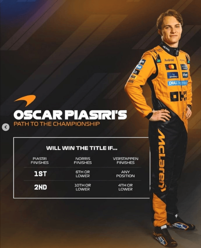 4.诺里斯第8,维斯塔潘第3或更低,且皮亚斯特里不夺冠