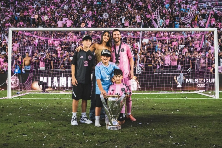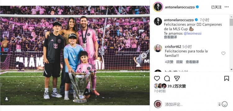 梅西妻子安东内拉社媒晒出全家与奖杯的合照,配文:“祝贺你,亲爱的,美职联冠军!我们爱你@leomessi”
