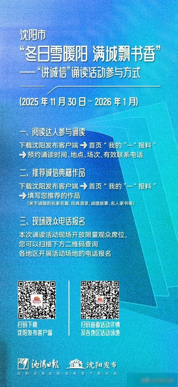12月7日10时,在沈阳市图书馆内,“冬日雪暖阳满城飘书香”——沈阳市图书馆“诵诚信之韵,品书香之醇”首场诵读活动火热启动,以诵读为媒,让诚信文化在冬日书香中浸润人心。
