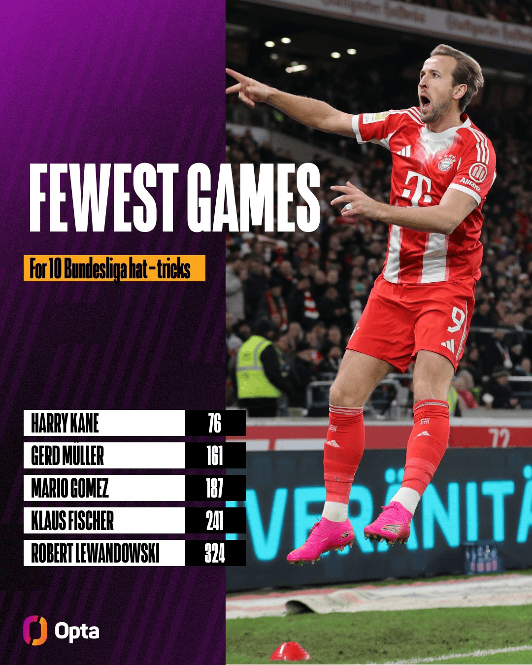 凯恩只用了76场比赛就完成了10次戴帽,相比之下,盖德-穆勒161场、戈麦斯187场、费舍尔241场、莱万多夫斯基324场。