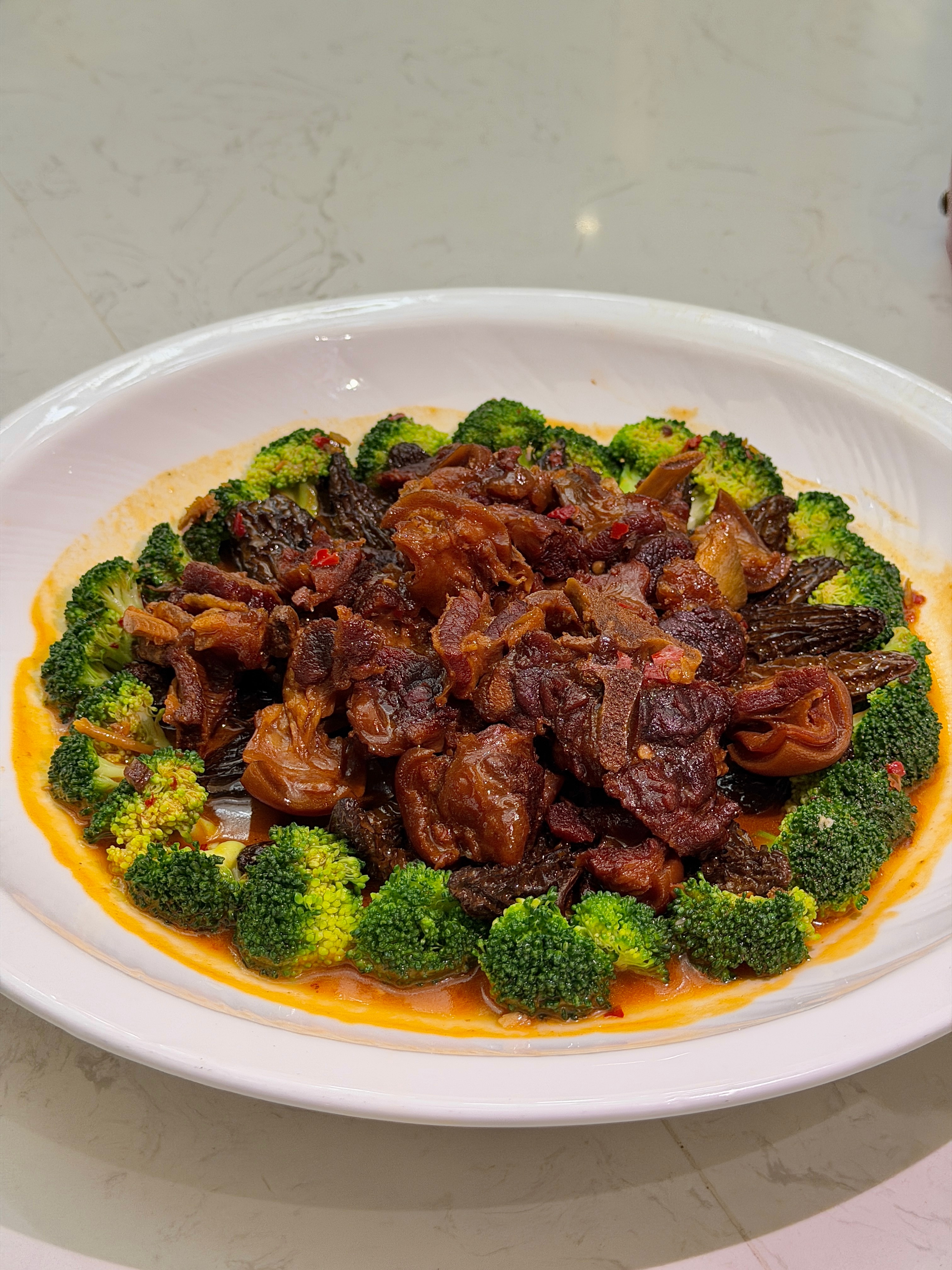 这桌肉,吃得星子我当场想搬去巴中放羊!咩~从清水炖煮到香辣轰炸,每道菜都把羊肉的“鲜”玩出了花!🐑 清炖羊肉 —— 先来碗原汤!揭开盖直接鲜气扑鼻,慢炖出的汤头清亮却够醇,羊肉酥软不塞牙,蘸一点椒盐就足够灵魂出窍。这是黄羊本味的“毕业展示”,排酸处理过没膻味,只有山间青草和玉米🌽喂出的淡淡甘香。🔥 红烧羊肉 —— 浓油赤酱派代表!羊肉炖到筋膜半化,吸饱了姜蒜辣与豆瓣香的酱汁,入口是咸鲜带微甜的复合冲击。肉块酥烂却不散,咬下去汁水在嘴里微微爆开,连里面的萝卜都成了抢手货!🍲 黄焖羊肉 —— 比起红烧更添一分“温和的浓郁”。酱汁勾得薄而妥帖,轻轻裹住每一块带皮羊肉,焖出了胶质般的软糯。花椒和青椒的香气似有若无,是那种悄悄让你额头冒细汗,筷子却停不下来的魔力。💡 灯影羊肉 —— 全场黑马!薄到透光的羊肉片炸得酥脆焦香,撒上芝麻,入口是“咔嚓”声伴随芝麻香的层层攻势。像在吃羊肉风味的薯片,但更鲜、更酥、更上头,妥妥的解馋神器!🍖 烤羊排 —— 压轴硬菜!炭火逼出羊排的油脂,外皮烤得焦脆微韧,内里却依然嫩得流汁。只撒简单调料,入口是直白的肉感暴击——焦香、油脂香、羊肉鲜甜三重奏,用手抓着啃才过瘾!💬 总结: 这一桌,从清炖的“纯”到灯影的“飒”,南江黄羊用实力证明——好羊肉真的能撑起一桌江湖!不膻不柴,鲜味自带层次,每种做法都像在讲不同的风味故事。四川南江黄羊的含金量还在上升游光雾仙山品南江黄羊