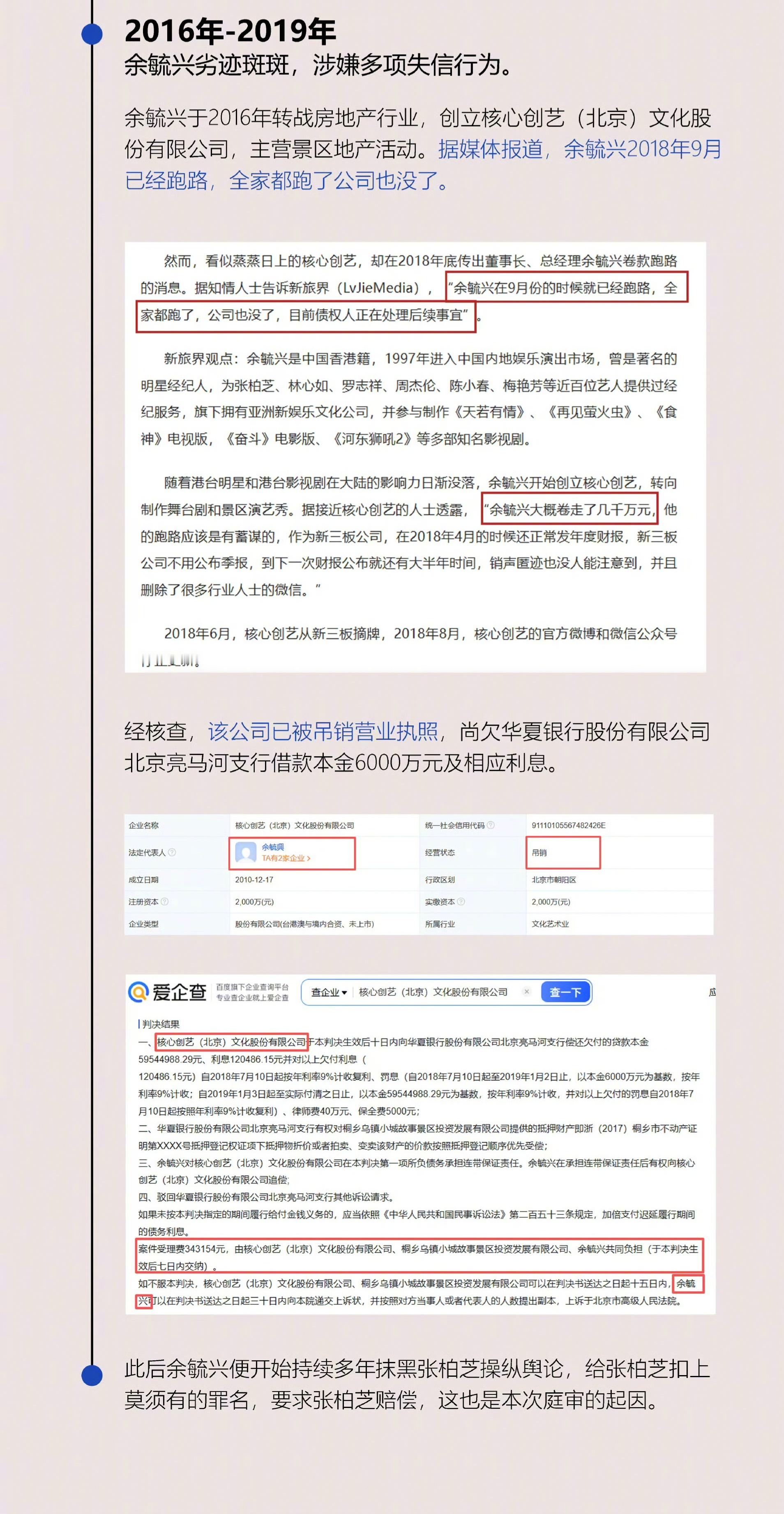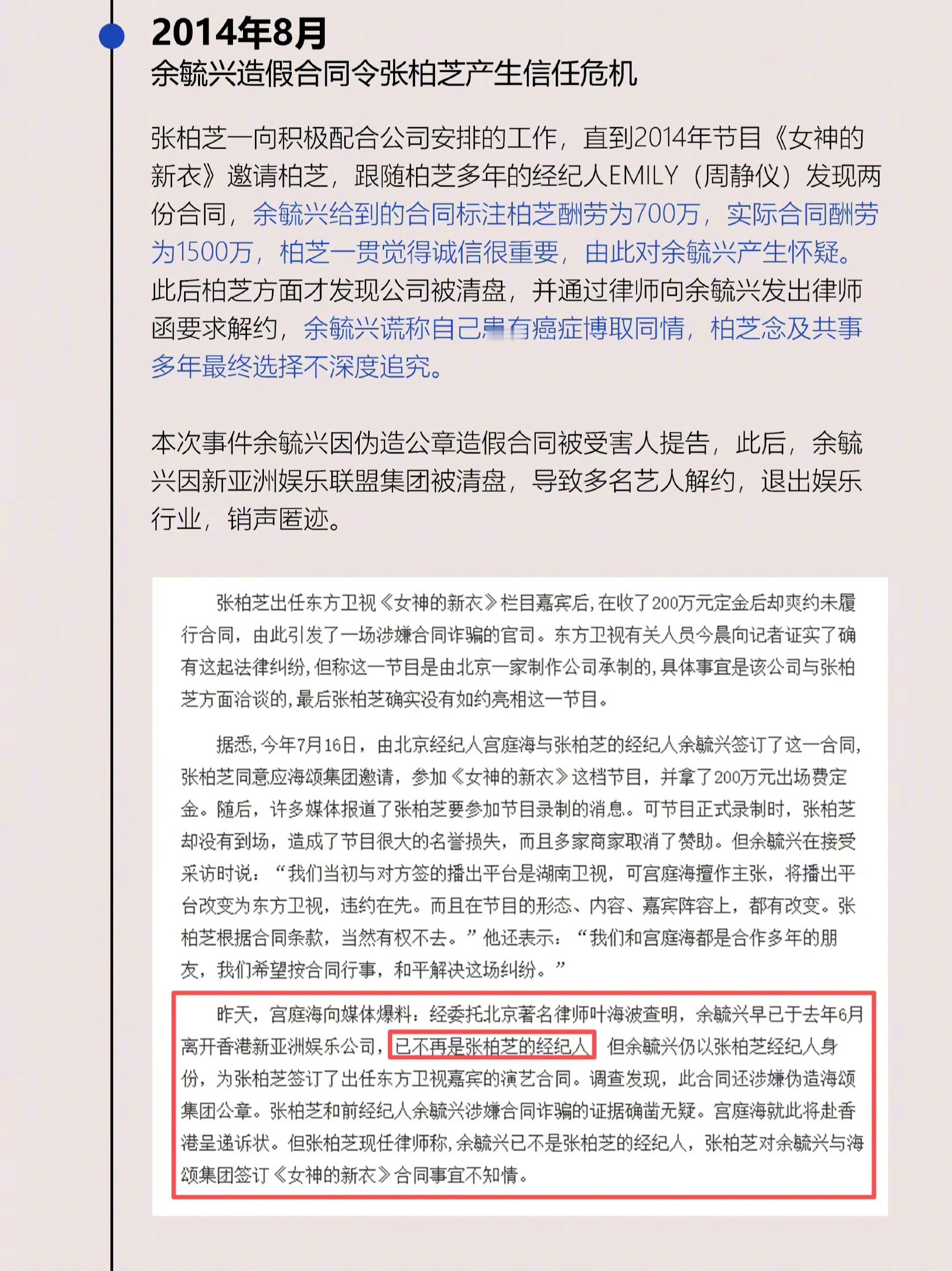 网友梳理张柏芝和前经纪人纠纷 网友梳理了张柏芝和前经纪人余毓兴的纠纷案件,看完时间线就知道完全是余毓兴在勒索和蒙骗张柏芝,弄假公章,假合同,公司破产之后柏芝还蒙在鼓里,现在反而倒打一耙,简直就是黑心人!这次真是张柏芝的无妄之灾,支持柏芝合理合法维权,保护自己的权益。