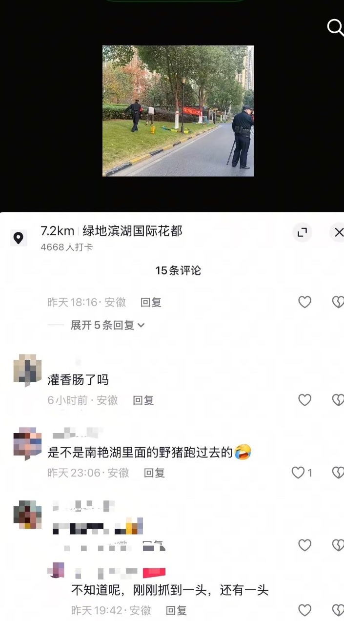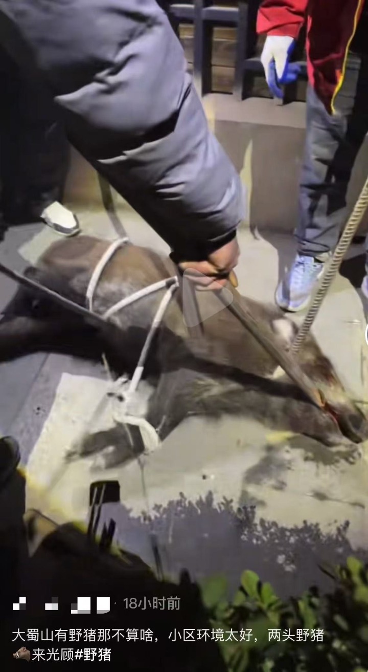 对于野猪的数量,小区业主的说法不尽一致。在小区活动广场,业主张先生告诉记者,他亲眼所见的是一只“不大不小、百十来斤”的野猪,并描述了抓捕时的场面,“天快黑的时候发现的,抓到时天都黑透了。得有几十号人在那儿围堵,还有业主拿着铁棍、铁锹帮忙。”而更多业主则表示,自己并未亲眼看见,只是在业主群里看到有人称有“一大一小两只”。