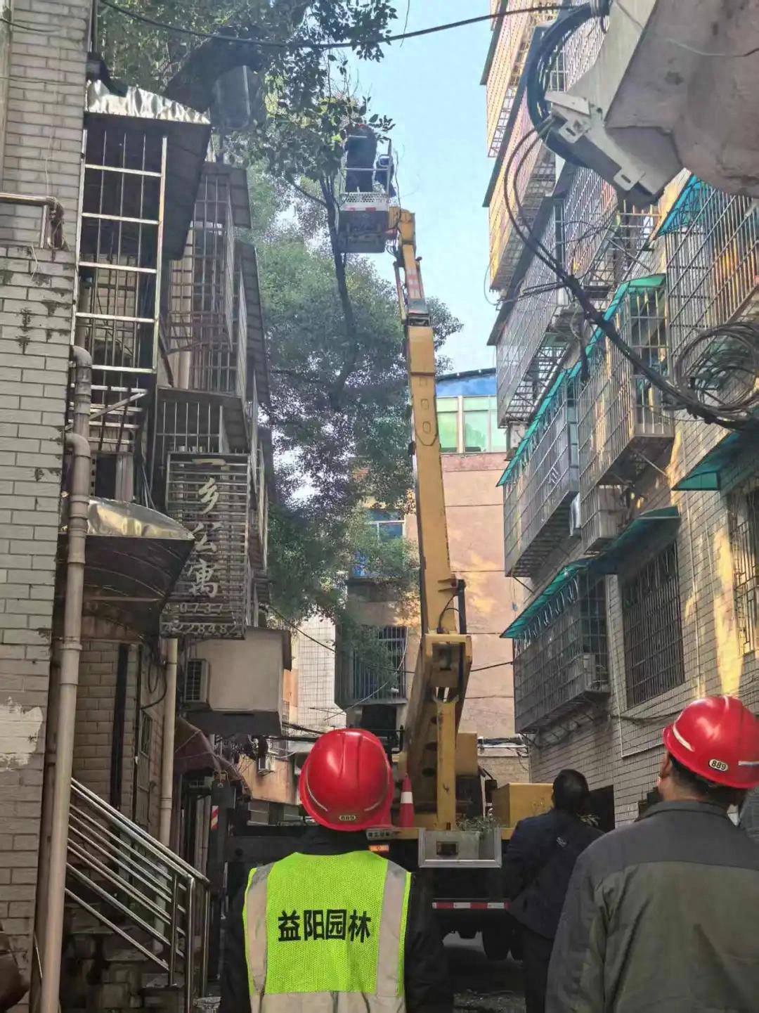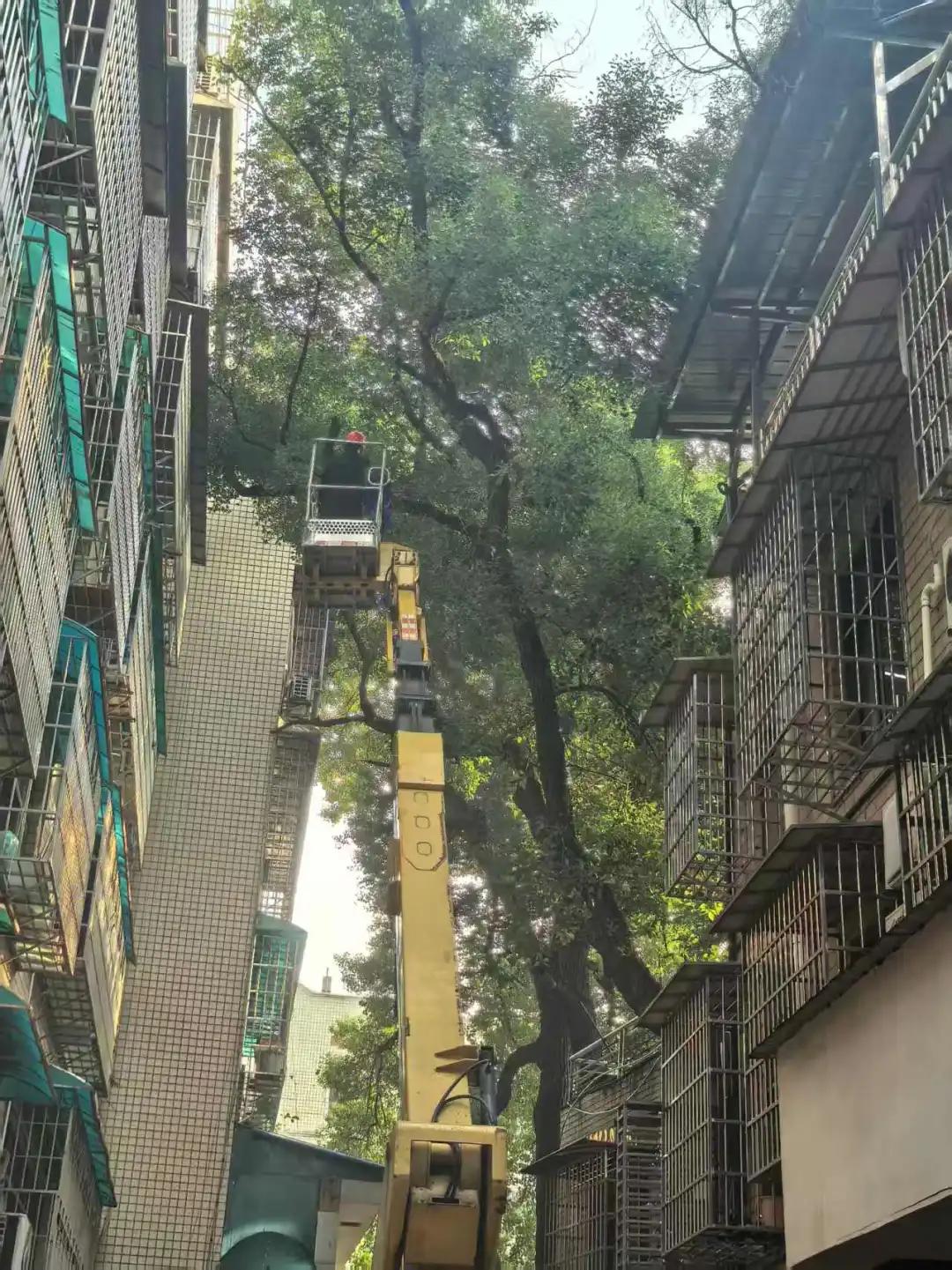 桃花仑社区老居民区是典型的无物业管理小区,7棵古树伴随社区走过多年岁月。然而,长期自然生长的枝干肆意延伸,不仅遮挡了居民楼的采光通风,风雨天气里更潜藏着枝干坠落的安全隐患,成为困扰居民的“心头病”。由于缺乏专业设备和养护技术,这一问题迟迟未能得到妥善解决。