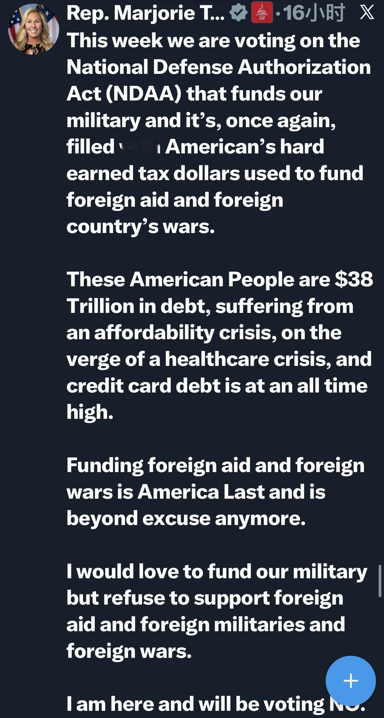 玛乔丽.泰勒.格林公开反对《国防授权法案》: 本周我们将对《国防授权法案》(NDAA)进行投票,该法案为我们的军队提供资金,而它再一次充斥着美国人辛辛苦苦挣来的税款,这些钱被用来资助对外援助和外国的战争。 美国人民背负着 38 万亿美元的债务,正遭受消费能力危机,濒临医疗保健危机,信用卡债务也达到了历史最高水平。 资助对外援助和对外战争是美国的末路,这种做法已经没有任何借口了。 我非常乐意为我们的军队提供资金,但我拒绝支持对外援助、外国军队和对外战争。 我在这里,我会投反对票。