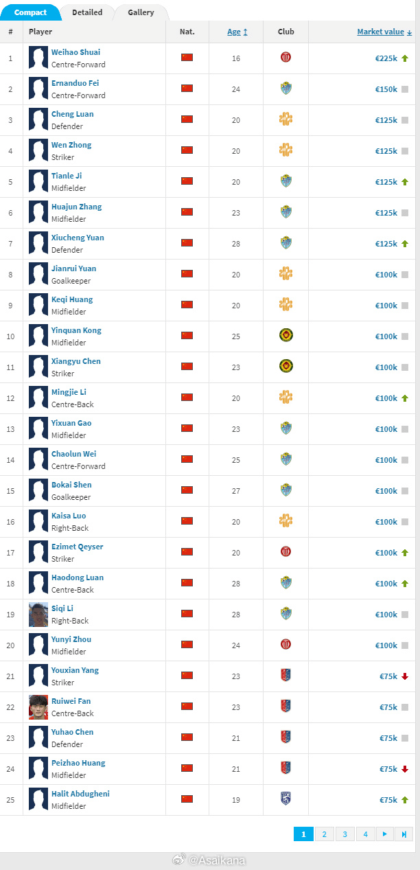 注意:此次更新不包含B队同时报名一线队的球员,这部分球员身价可能会在中超更新时一并更新。
