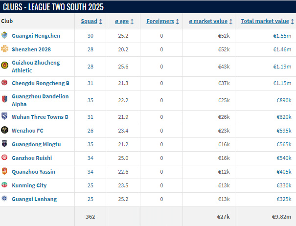 俱乐部总身价方面,广西恒宸以155万欧元排名第一,深圳2028以146万欧元排名第二,无锡吴钩以143万欧元排名第三,海门珂缔缘以128万欧元排名第四。