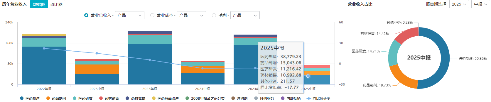 而作为利润核心的药品制剂业务,毛利率虽高达42.39%,受集采政策、市场竞争加剧影响,前三季度营收2.27亿元同比大幅下滑37.73%,核心产品双黄连口服液面临着河南福森、哈药三精等对手的激烈竞争,市场份额承压。