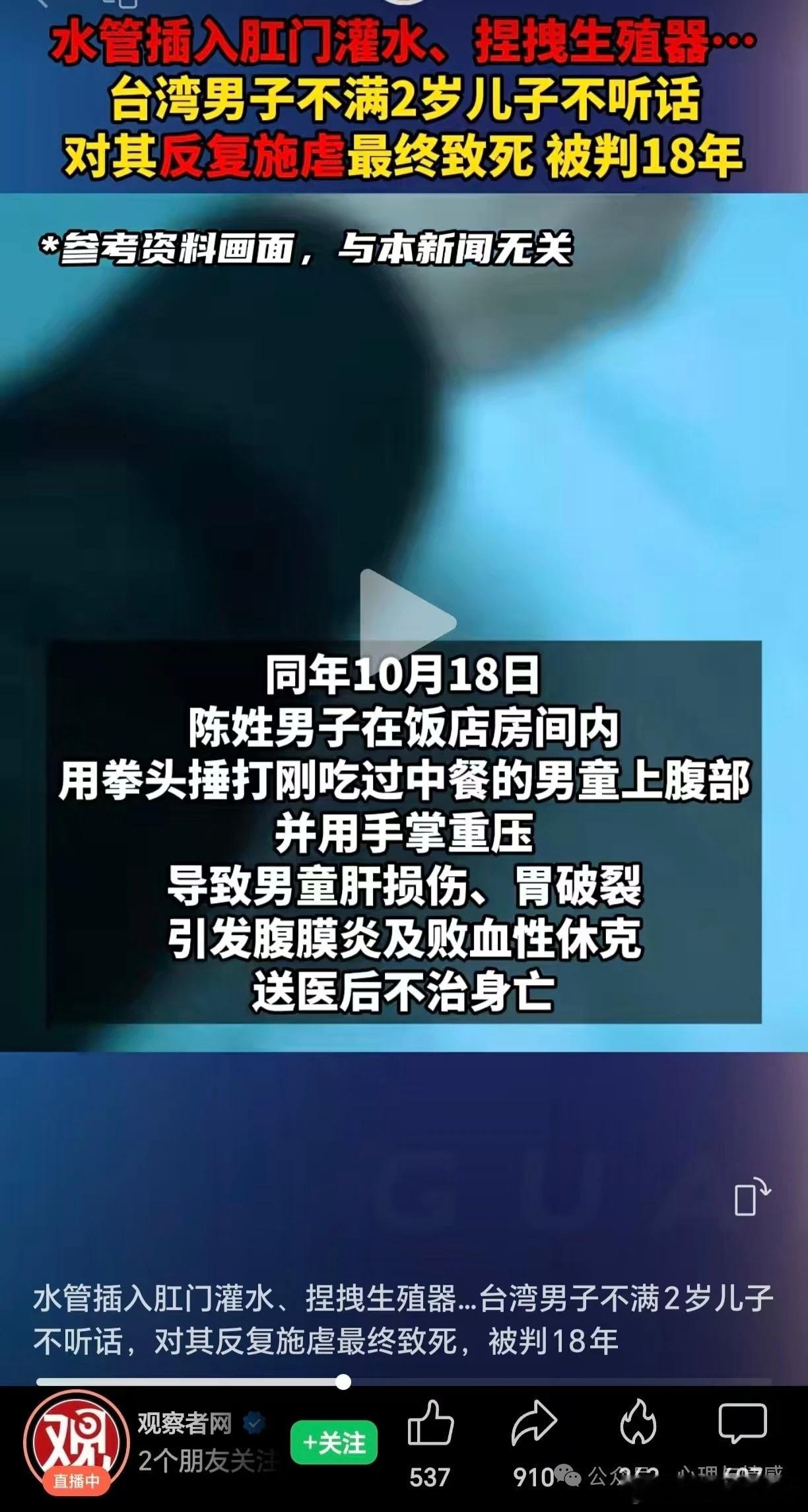 台男子残忍虐死2岁儿子被判18年 恶魔在人间!水管插入肛门灌水、捏拽生殖器…台湾男子对不满2岁儿子施虐致死,被判18年还不服观察者网的公众号发布了一则消息,台湾31岁男子陈某,因不满2岁的幼子 “不服管教”,对这个毫无反抗能力的孩子残忍施虐。他对孩子做的简直骇人听闻、令人发指。直至一次在饭店房间内,他用拳头猛捶刚吃过饭的孩子上腹部,还以手掌重重按压,直接导致孩子肝损伤、胃破裂,进而引发腹膜炎及败血性休克,最终送医不治身亡。法院审理后,以成年人故意对儿童伤害致死罪判处陈某18年有期徒刑。令人不齿的是,陈某以“量刑过重”为由上诉,竟声称判决未考量其年幼女儿的利益。好在台南法院及最高法院均驳回上诉,维持原判。年幼的女儿能在这样的父亲身边存活,已是万幸。用女儿的利益当作减罪借口,何其荒谬——对女儿而言,最大的生命威胁恰恰来自他本人!如此漠视生命、虐待至亲的人,根本不配拥有为人父母的资格。类似的惨剧早已敲响警钟。此前贵州一男子长期家暴,妻子不堪忍受提出离婚,他竟在离婚冷静期的第二日,丧心病狂地给亲生儿女灌服农药,残忍毒杀亲子。都说“虎毒不食子”,可这些施暴者的恶行,比猛虎更冷血、更残忍,完全突破了人性的底线。家暴从不是“家务事”,而是摧毁生命、撕裂家庭的恶性犯罪。更值得警惕的是,家暴具有极强的成瘾性和升级性,绝无“改过自新”的侥幸。遇到家暴男,千万不要抱有“他会变好”的幻想,不要拿付不起的代价去赌他们的底线。珍惜生命,远离家暴者。面对家暴,零容忍是唯一的态度,及时止损是最好的自保。愿法律能成为弱者最坚实的后盾,愿每一个生命都能远离暴力阴影,在安全与尊重中成长。