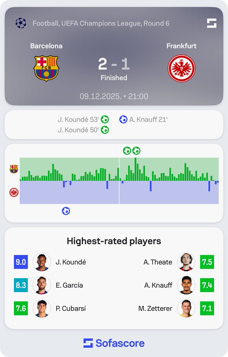 虎扑12月10日讯据Sofascore官号报道,巴塞罗那后卫孔德今天的表现令人难忘,他梅开二度带队逆转法兰克福。