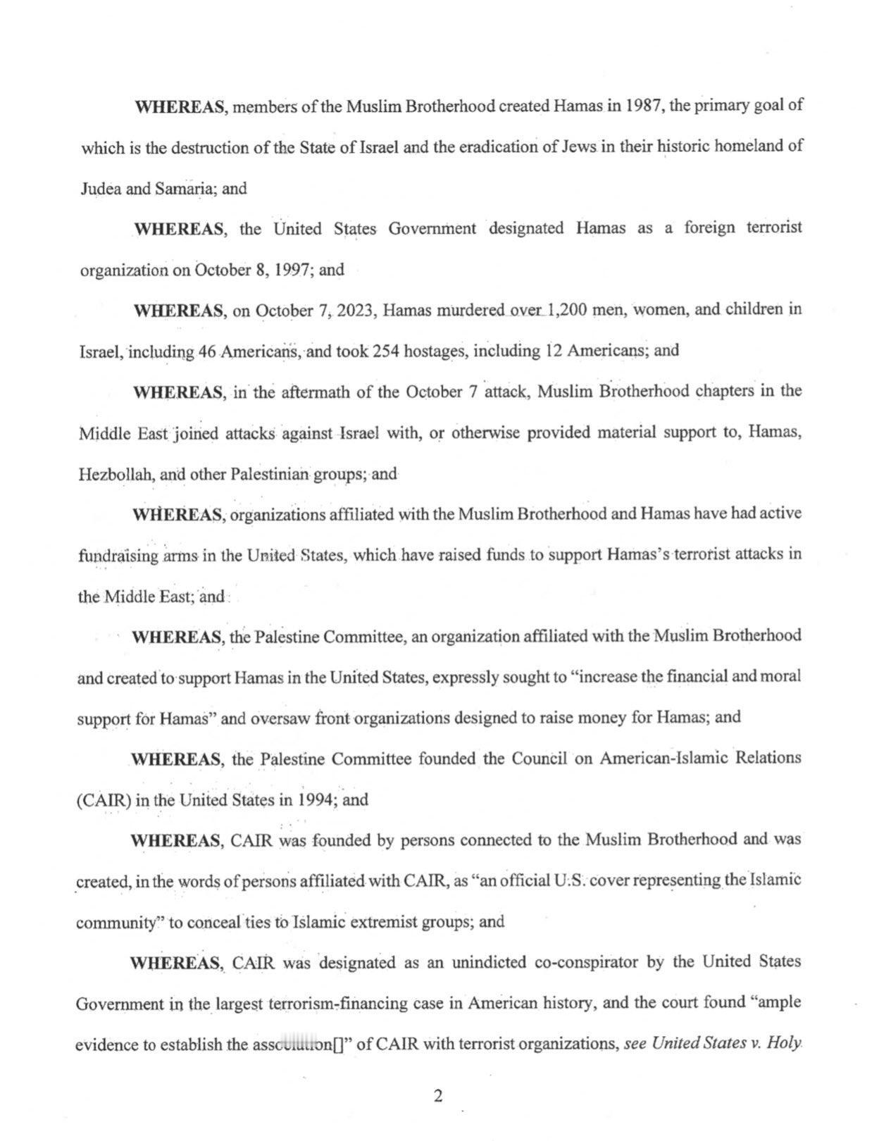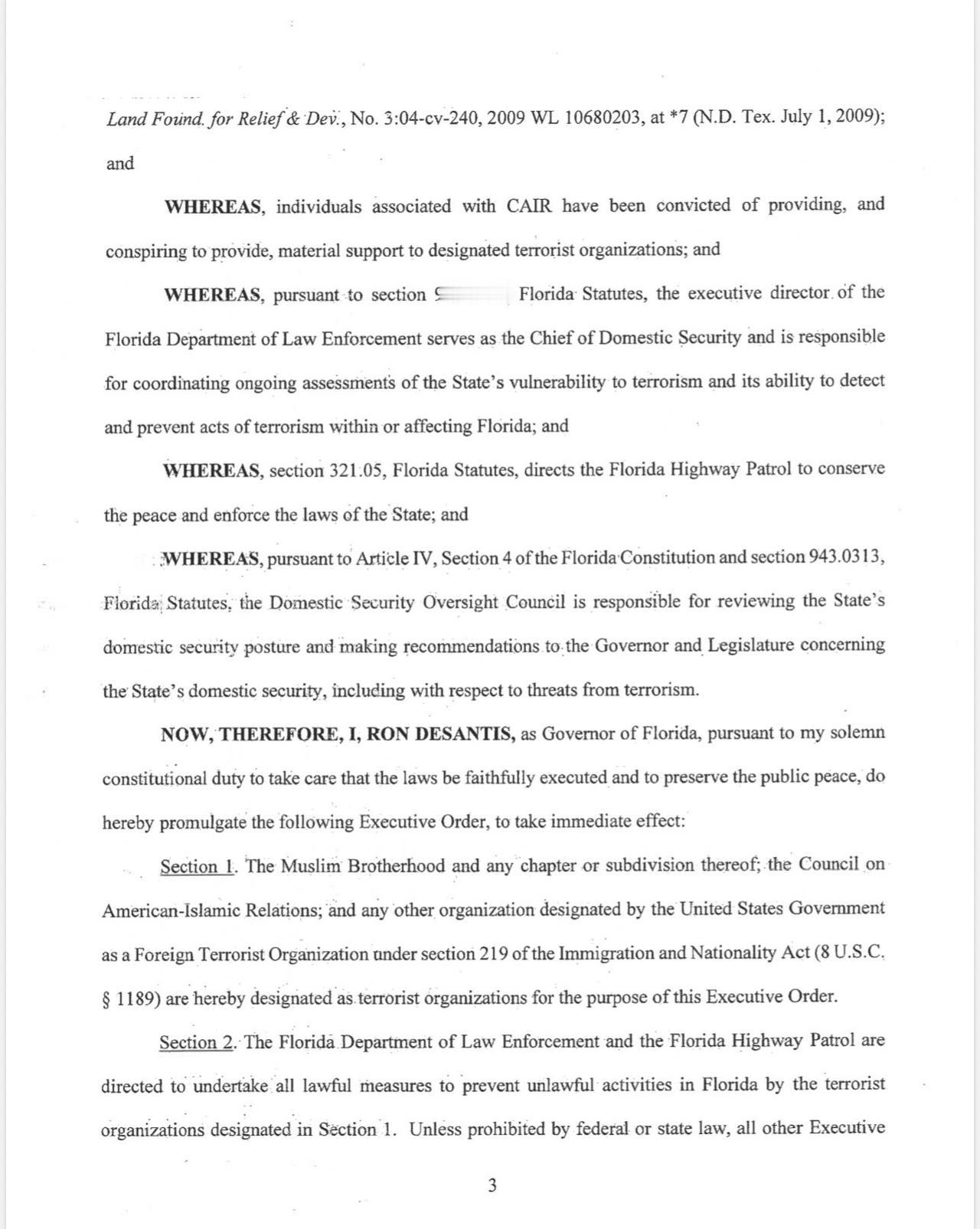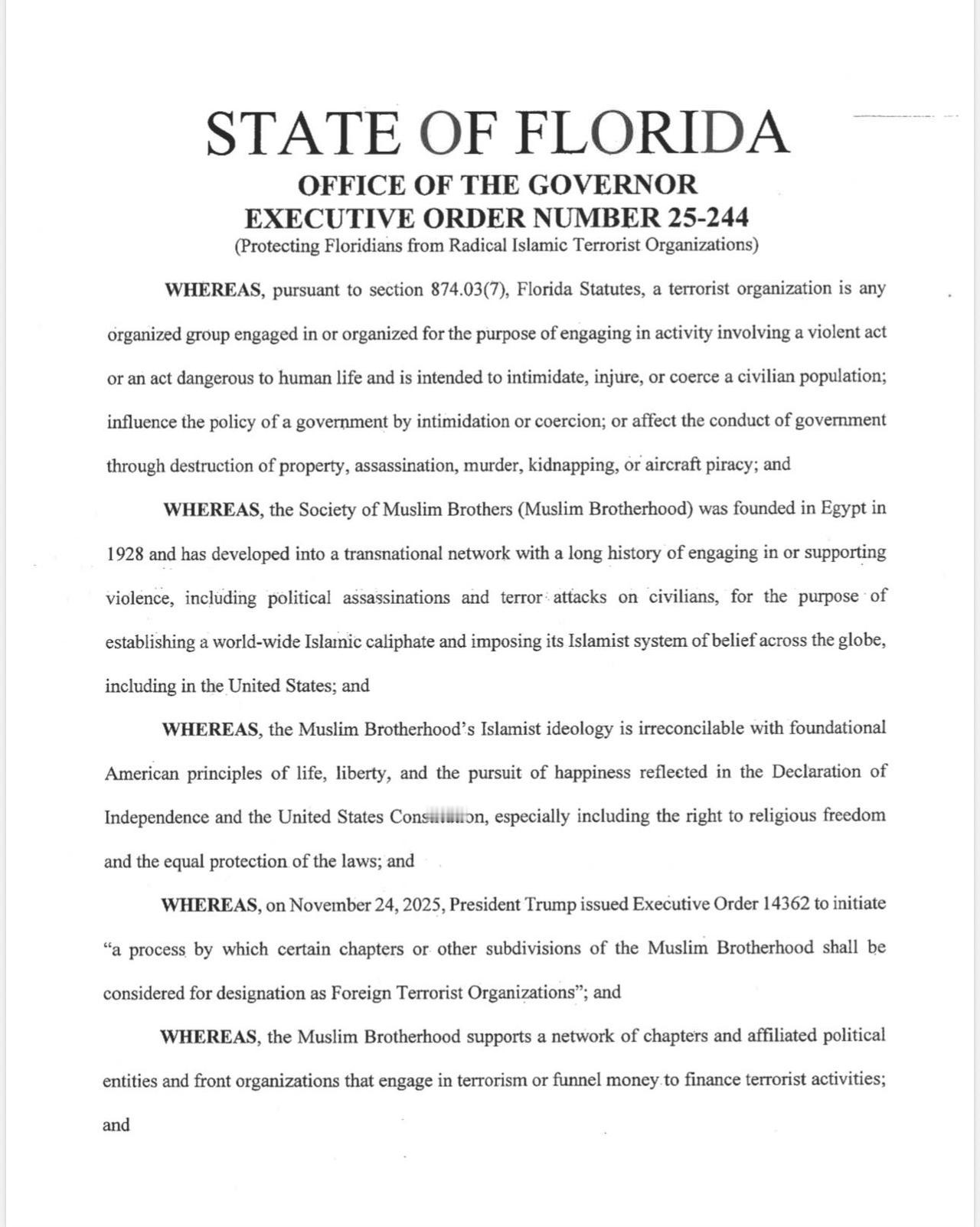 佛罗里达州州长签署法律文件: “立即生效 佛罗里达州将穆斯林兄弟会和美国伊斯兰关系委员会(CAIR)认定为外国恐怖组织。 特此指示佛罗里达州各机构采取一切合法措施,防止这些组织从事非法活动,包括拒绝向任何提供物质支持的人员提供特权或资源。”
