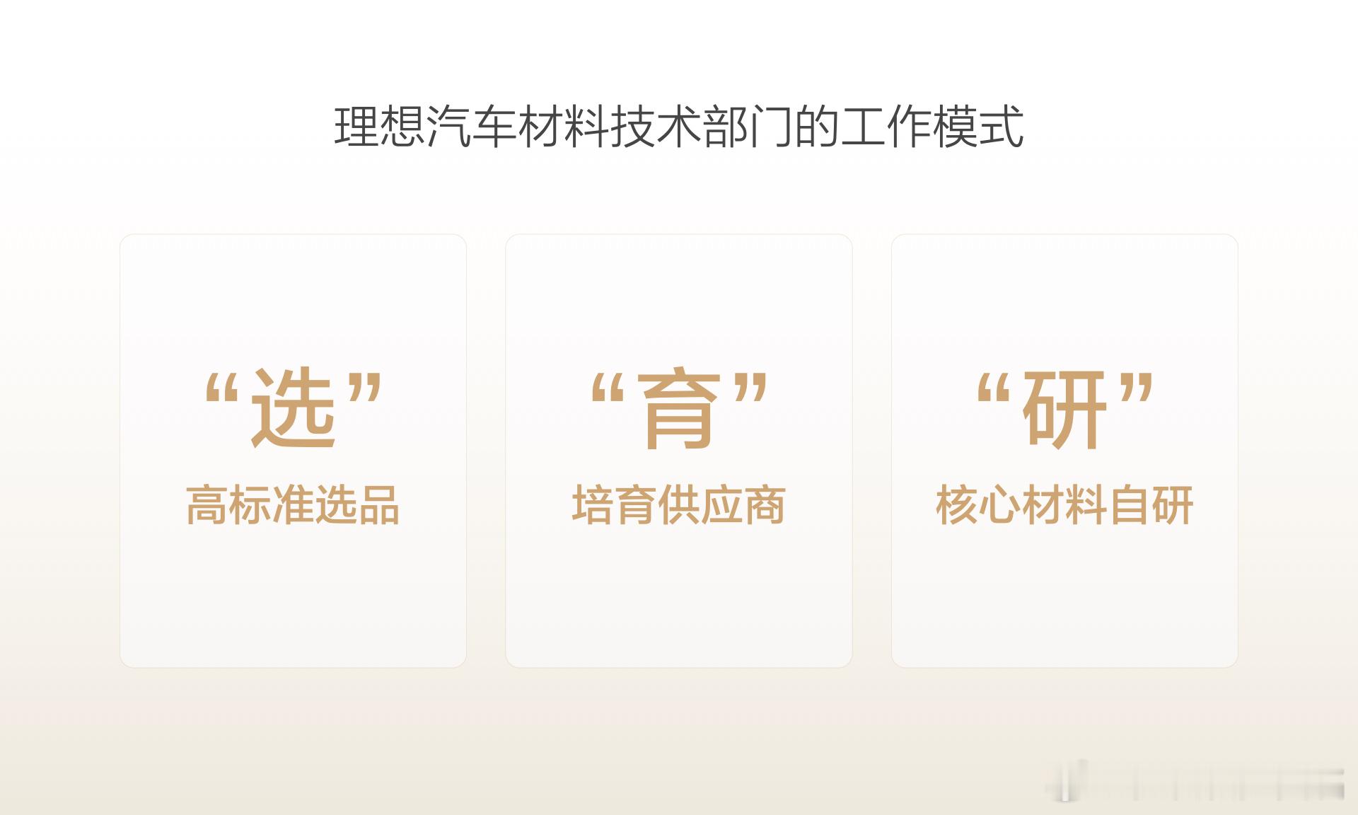昨天参加了“理想材料技术日”,很喜欢打的比方。像沃尔玛、家乐福、物美这样的传统超市,主要工作就是选品,但以胖东来、盒马为代表的新零售不仅会选品,还会与供应链共创、甚至自研超级爆品,这是他们成功的秘诀,也是最关键的差异化竞争力。在材料问题上,理想也秉承一样的思路。“选”是基础,理想会基于严格的标准,选择业内最成熟最优秀的方案;其次是“培”,当行业标准品没法满足理想的性能要求时,就会引导或者培育供应商开发高性能的新材料;最后就是“研”,面对业内没有成熟方案,但对用户来说又非常重要的部件或技术时,理想就会躬身入局,撸起袖子自己干。简单概括,全栈自研不是最优路径,全栈可控才是长久大计。理想材料研发成果大盘点 汽场全开