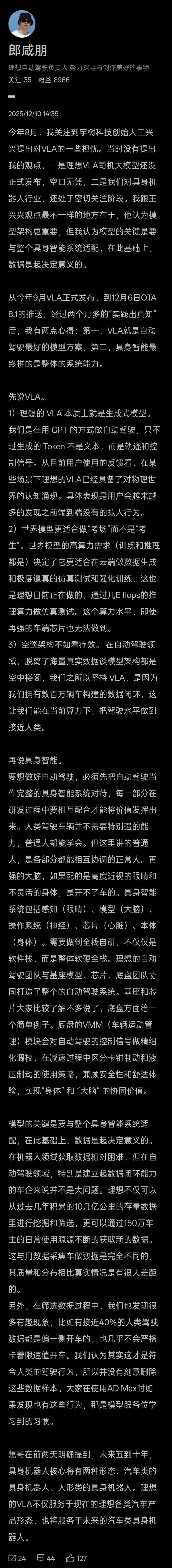 今日,理想汽车自动驾驶研发高级副总裁郎咸朋发长文回应宇树科技CEO王兴兴早期对VLA的质疑。