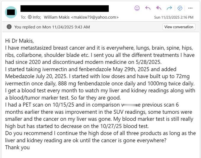最新文章:伊维菌素、芬苯达唑和甲苯达唑治疗案例——一位66岁的加州女性,患有四期乳腺癌,全身转移,在接受治疗6个月后汇报情况。大型制药公司非常喜欢这些癌症患者证词,他们说:“更多!……给我们更多!” 😂🚨触发警告:这位患者于2025年5月停止了传统的肿瘤治疗。没有化疗,没有免疫疗法,也没有激素疗法。结果会让你震惊……故事:加州一名66岁女性,患有四期乳腺癌,癌细胞已扩散至全身。2013 年首次确诊,2020 年复发,已发展至 4 期,扩散至骨骼和肺部。2023年12月至2024年8月期间服用来曲唑2024 年 8 月至 2025 年 4 月 28 日期间服用氟维司群。她一停下来,她的 CA15-3 值就从 900 多跃升至 1200 多。“我……于2025年5月28日停止使用现代医学。”2025年5月29日,她开始了:伊维菌素从每天12毫克增加到每天72毫克。芬苯达唑 888毫克/天2025年7月20日,她补充道:甲苯咪唑 500 毫克/天,逐渐增加至 2000 毫克/天CA15-3 在 8 月 27 日达到峰值 1278,但终于开始下降down.这个案子并不轻松。我们一开始并不确定是否取得了进展……CA 15-3 水平保持平稳或略有上升,直至达到以下剂量:伊维菌素 72毫克/天芬苯达唑 888毫克/天甲苯咪唑 2000 毫克/天但是后来……“我于2025年10月15日做了一次PET扫描,与6个月前的扫描相比,SUV读数有所改善,一些肿瘤变小了,肝脏上的癌症也消失了。”传统肿瘤学说:“不可能”。这就是现代肿瘤学的现状。一位四期乳腺癌患者在接受了现代肿瘤学所能提供的最佳药物治疗四年后,病情仍然持续恶化,直到她喊出“够了,再也不治疗了”。当然,灾难随之而来……对吧?对吧?错!她服用了三种驱虫药,现在她的癌症正在消失。她的肝转移灶也消失了。每五年投入 250 亿美元用于癌症研究,他们却没能找到“驱虫药”。见鬼,我没收到一分钱的癌症研究经费,但我们却是癌症研究和癌症治疗领域的前沿力量,表现优于所有人。只有佛罗里达州明白这一点。懂的都懂😃NEW ARTICLE: IVERMECTIN, FENBENDAZOLE and MEBENDAZOLE Testimonial - 66 year old California Woman with Stage 4 Breast Cancer metastatic everywhere reports after 6 monthsBig Pharma loves these Cancer Testimonials so much, they said "more!...give us more!" 😂🚨TRIGGER WARNING: This patient quit conventional Oncology in May 2025. No chemo. No immunotherapy. No hormone therapy. The results will shock you...STORY:66 year old California Woman with Stage 4 Breast Cancer metastatic everywhereInitially diagnosed in 2013, recurred in 2020 as Stage 4 to bones, lungs.Was on Letrozole Dec.2023 to Aug.2024Was on Faslodex Aug.2024 to Apr.28, 2025. Once she stopped, her CA15-3 jumped from 900s to 1200s.“I...discontinued Modern medicine May 28, 2025”May 29, 2025 she started:Ivermectin 12mg/day increased to 72mg/dayFenbendazole 888mg/dayJuly 20, 2025 she added:Mebendazole 500mg/day increasing to 2000mg/dayCA15-3 peaked at 1278 in August 27 but has finally started going down.This case has not been easy. We weren't sure we were making progress....CA 15-3 was flat or rising until the following doses were reached:Ivermectin 72mg/dayFenbendazole 888mg/dayMebendazole 2000mg/dayBut then..."I had a PET scan on 10/15/25 and in comparison with the previous scan 6 months earlier, there was improvement in the SUV readings, some tumors were smaller and the cancer on my liver was gone"Conventional Oncology says: "IMPOSSIBLE".This is the state of modern Oncology. A Stage 4 Breast Cancer patient keeps progressing for 4 years on the best drugs Modern Oncology can offer, getting worse and worse until she says "ENOUGH. NO MORE"Naturally, disaster follows...right? Right? WRONG.She takes three "dewormers" and now her cancer is disappearing. Her liver metastases are gone.$25 billion goes into Cancer Research every 5 years and they couldn't figure out "dewormer". Heck, I received $0 Cancer Research funding and we're the ones at the cutting edge of Cancer Research and Cancer Care, outperforming EVERYONE.Florida is the only state that gets it. IYKYK 😃