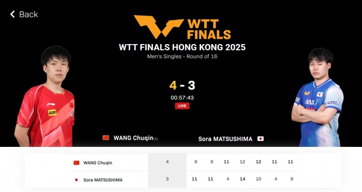 直播吧12月10日讯WTT总决赛男单1/8决赛,王楚钦对阵日本选手松岛辉空。