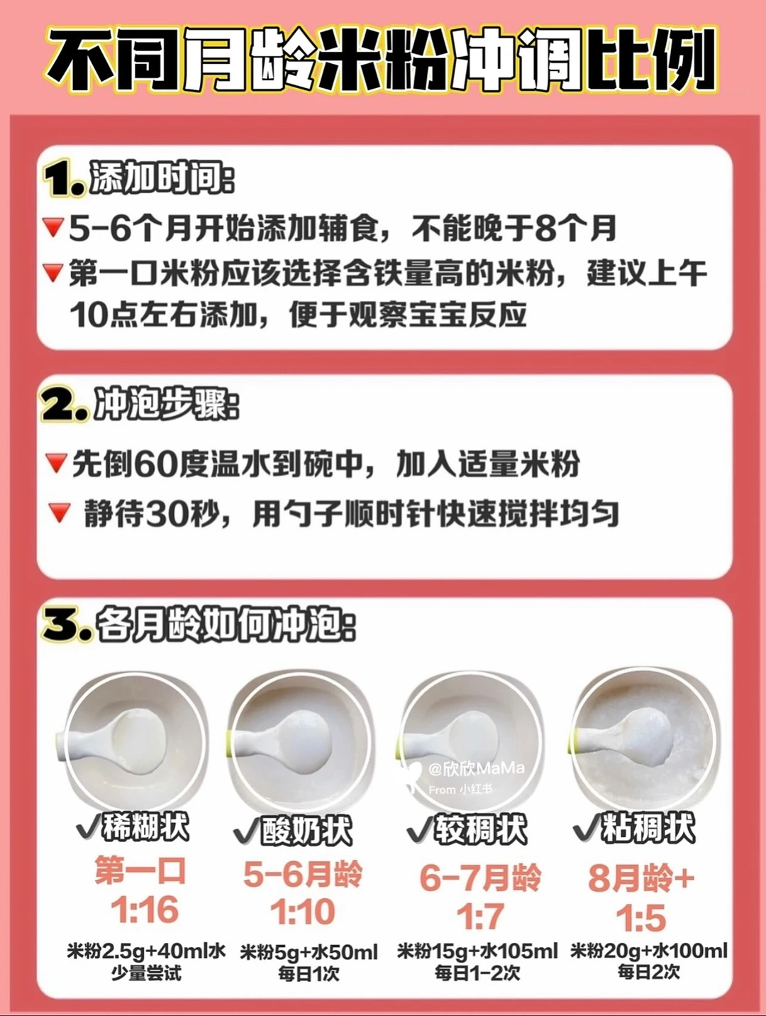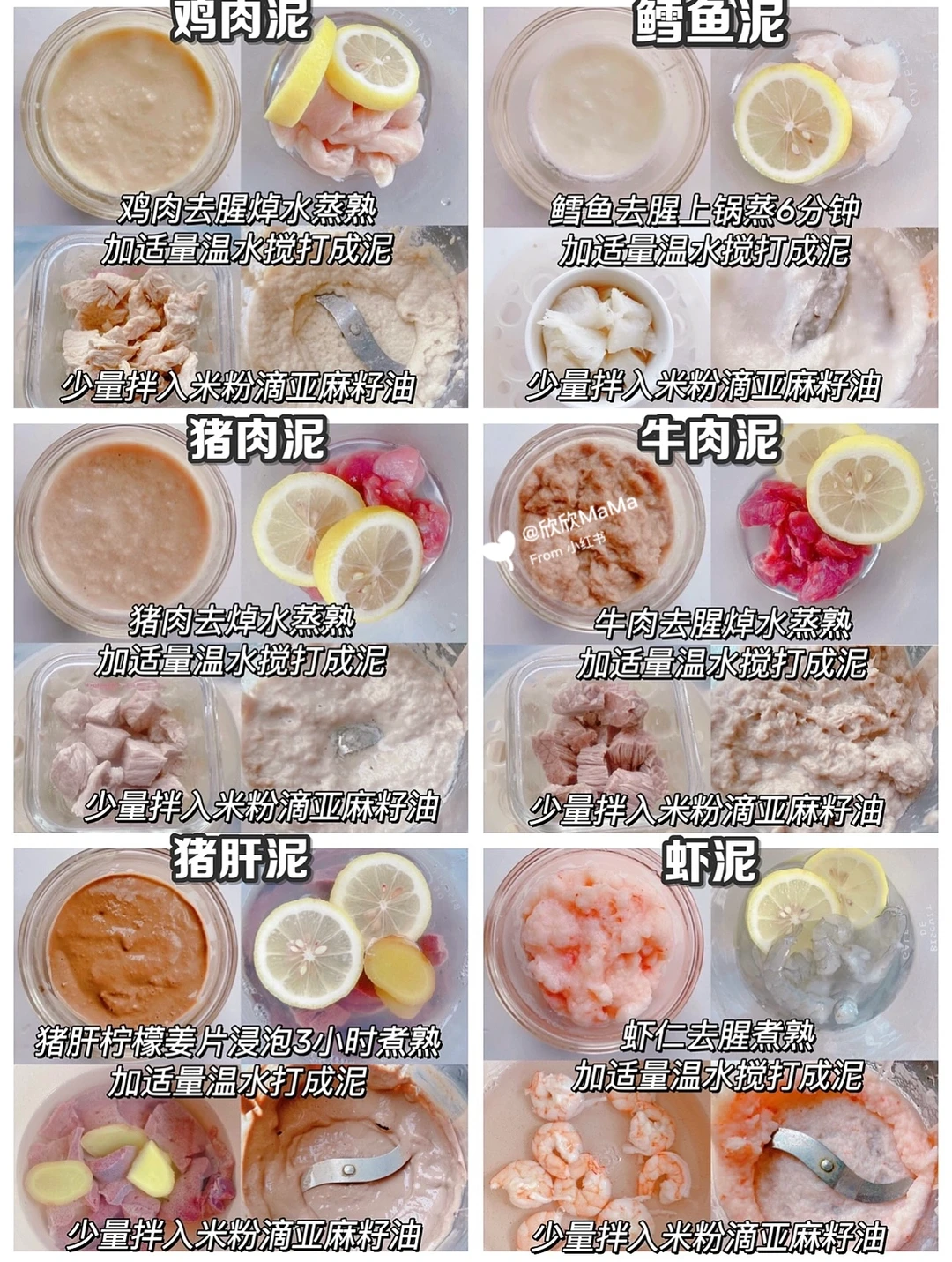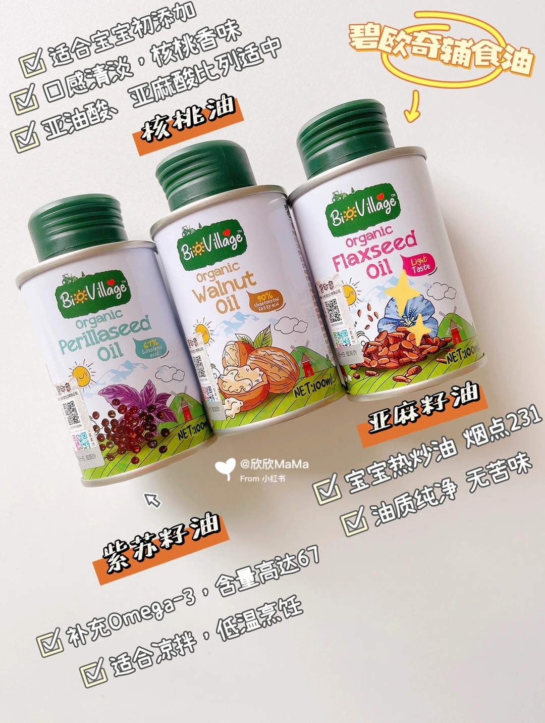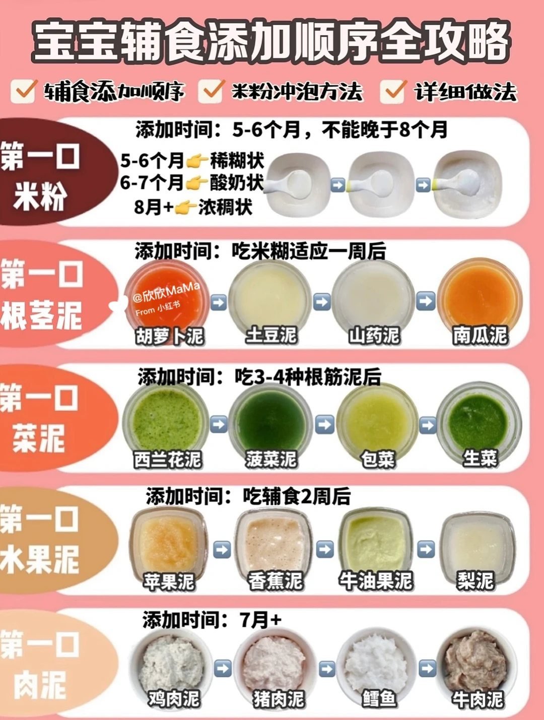 6月龄的宝宝就可以添加辅食了!但作为新手妈妈,辅食该怎么添加?辅食顺序应该怎么样?今天跟大家分享下24款常见辅食泥的做法,希望整理的对你们有用~ . 🔻米粉冲泡方法 宝宝第一口辅食应该选择高铁米粉 米粉冲泡步骤: 先倒60度温水到碗中,加入适量米粉, 静待30秒,用勺子顺时针搅拌均匀 . 🔻添加辅食顺序 宝宝添加高铁米粉一周后,就可以在辅食里添加蔬菜泥拉.刚开始从根茎泥开始,添加辅食2周后就可以添加辅食油啦! . ⚠️ 每添加一种食材3天排敏期,如辅食泥第一天1-2勺,第2天2-3勺逐渐增加拌入米粉里滴入核桃油搅拌食用,水果泥单独吃! . 🔻碧欧奇辅食油 我给欣欣添加米糊的时候搭配的是碧欧奇核桃油,它口感清淡,吃起来有淡淡的核桃香,每次我做辅食我都会滴几滴,宝宝爱吃,用的放心. 宝宝辅食多样化后,我就入手了碧欧奇亚麻籽油,它烟点231度,可以凉拌也可以热炒,并且油脂纯无苦味,宝宝接受接受度高! 到后来又入手了一瓶碧欧奇紫苏籽油,它是目前植物中a-亚麻酸含量比较突出的一种辅食油,适合宝宝烹饪凉拌的油. 平时我都交替使用着,它们是避光金属包装,更容易保存,并且小容量,宝宝可以很快吃完,不用担心油脂放久了变质! . 🔻根茎泥 🕒:吃米粉一周后开始添加 🛒食材:胡萝卜、土豆、南瓜、山药等 . 🔻蔬菜泥 🕒:吃3-4种根茎泥后 🛒食材:西兰花、菠菜等 👩‍🍳做法:食材先用盐水浸泡十分钟,用清水反复清洗,水开放入锅中煮熟,加适量温水辅食机搅打呈泥少量拌入米粉里滴辅食油 . 🔻水果泥 🕑:添加辅食半个月后,安排在午睡后吃 🛒食材:苹果、香蕉、牛油果、雪梨等 👩‍🍳做法:直接刮泥勺刮出泥或削皮切块辅食机搅打呈泥(小月龄宝宝水果可蒸几分钟) . 🔻鱼肉泥 🕐:7-8月逐渐增加 先吃白肉再吃红肉 虾8月再添加 🛒食材:鸡肉、猪肉、鱼肉、牛肉 👩‍🍳做法:食材洗净用生姜水浸泡十分钟去腥,锅中焯水去浮沫冲洗几遍,上蒸锅蒸20分钟加适量温水辅食机搅打呈泥少量拌入米粉里滴入辅食油 . 🔻混合泥 🕙:7月逐渐添加 吃一种泥长时间会单调,辅食应该逐渐多样化,如果不过敏可以把吃过的菜泥肉泥混合一起搭配着吃! 7个月宝宝辅食|