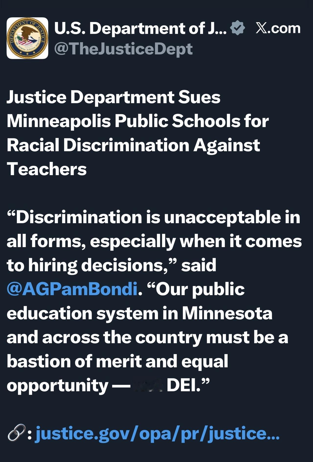美国司法部起诉明尼阿波利斯公立学校,指控其对教师存在种族歧视。 “任何形式的歧视都是不可接受的,尤其是在招聘决策方面,” 司法部部长邦迪AGPamBondi说道。“明尼苏达州乃至全国的公共教育系统必须成为择优录取和机会均等的堡垒,而不是多元、公平和包容(DEI)的堡垒。”