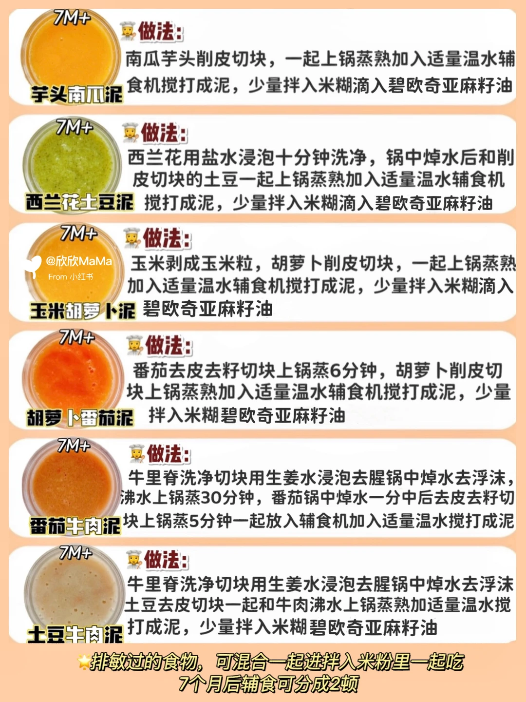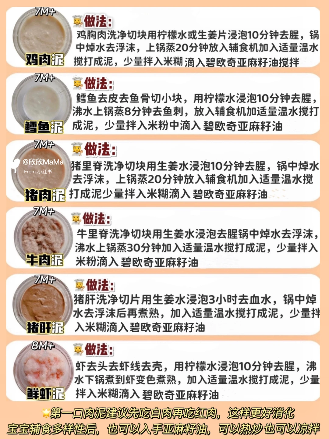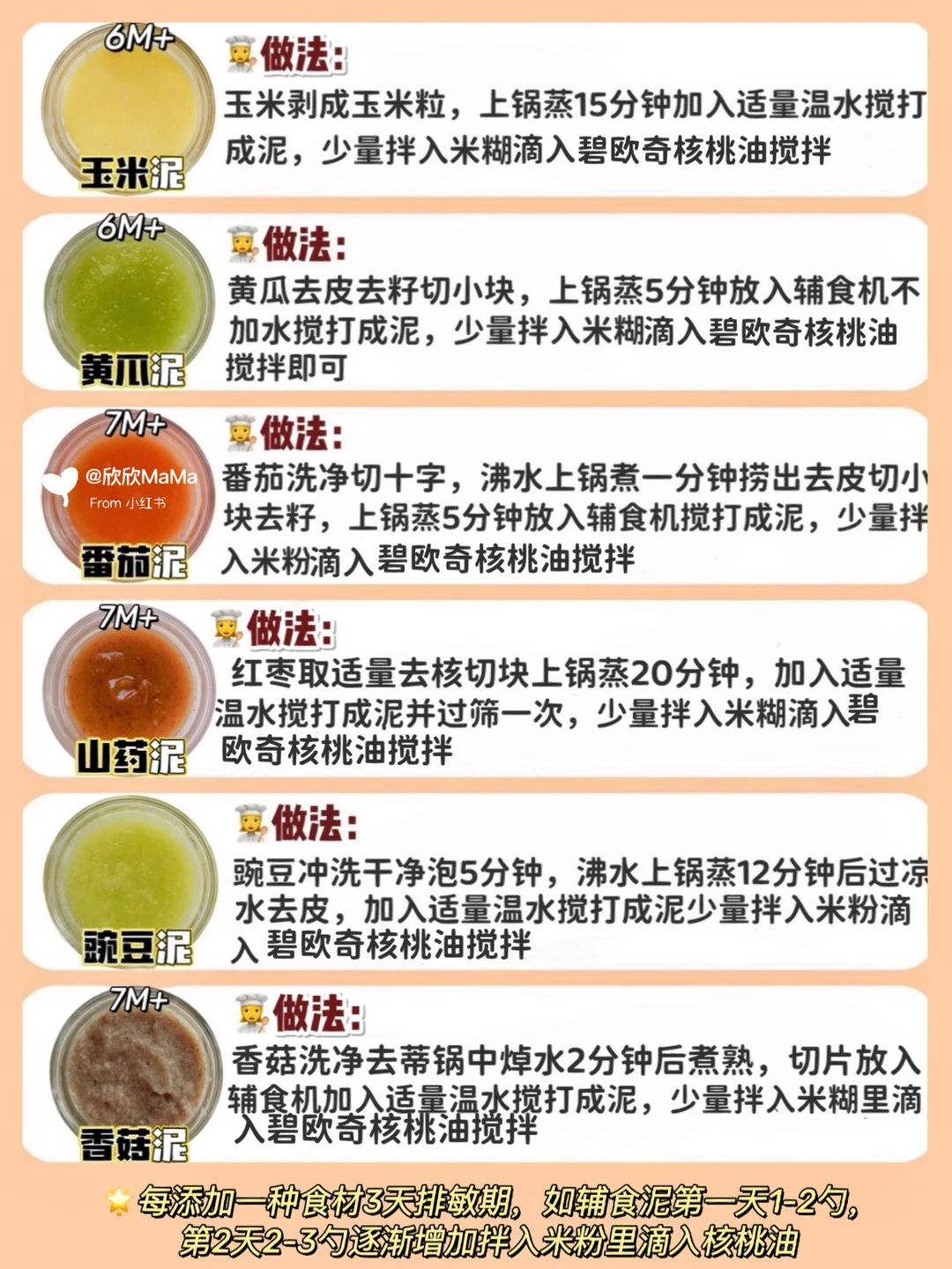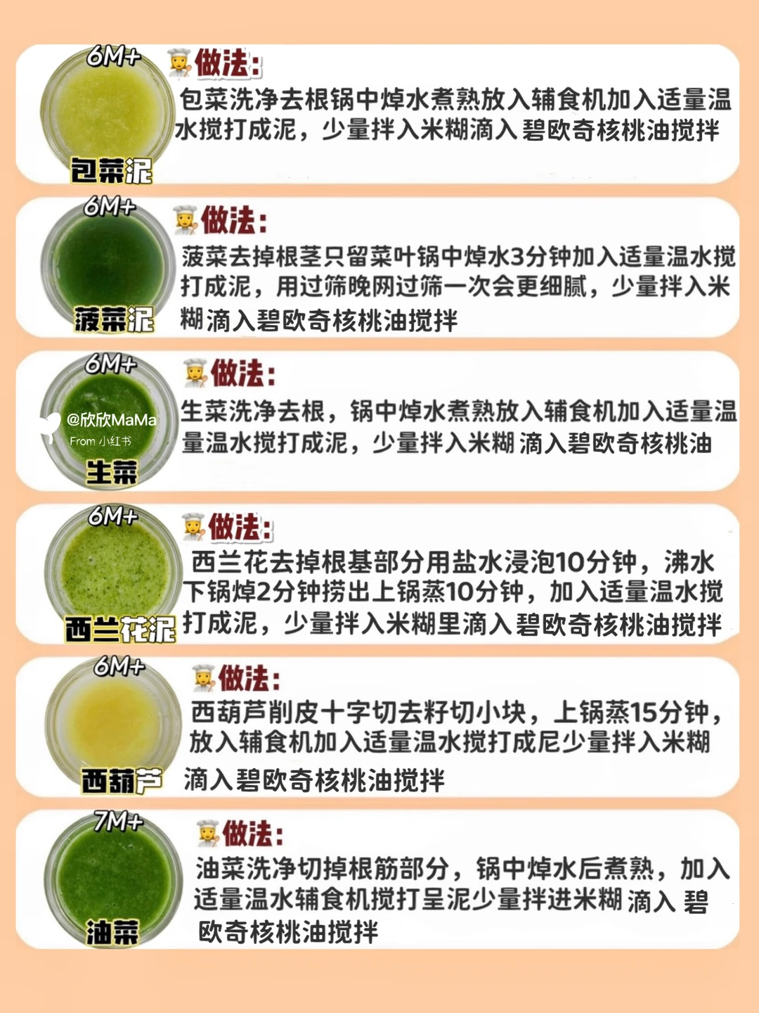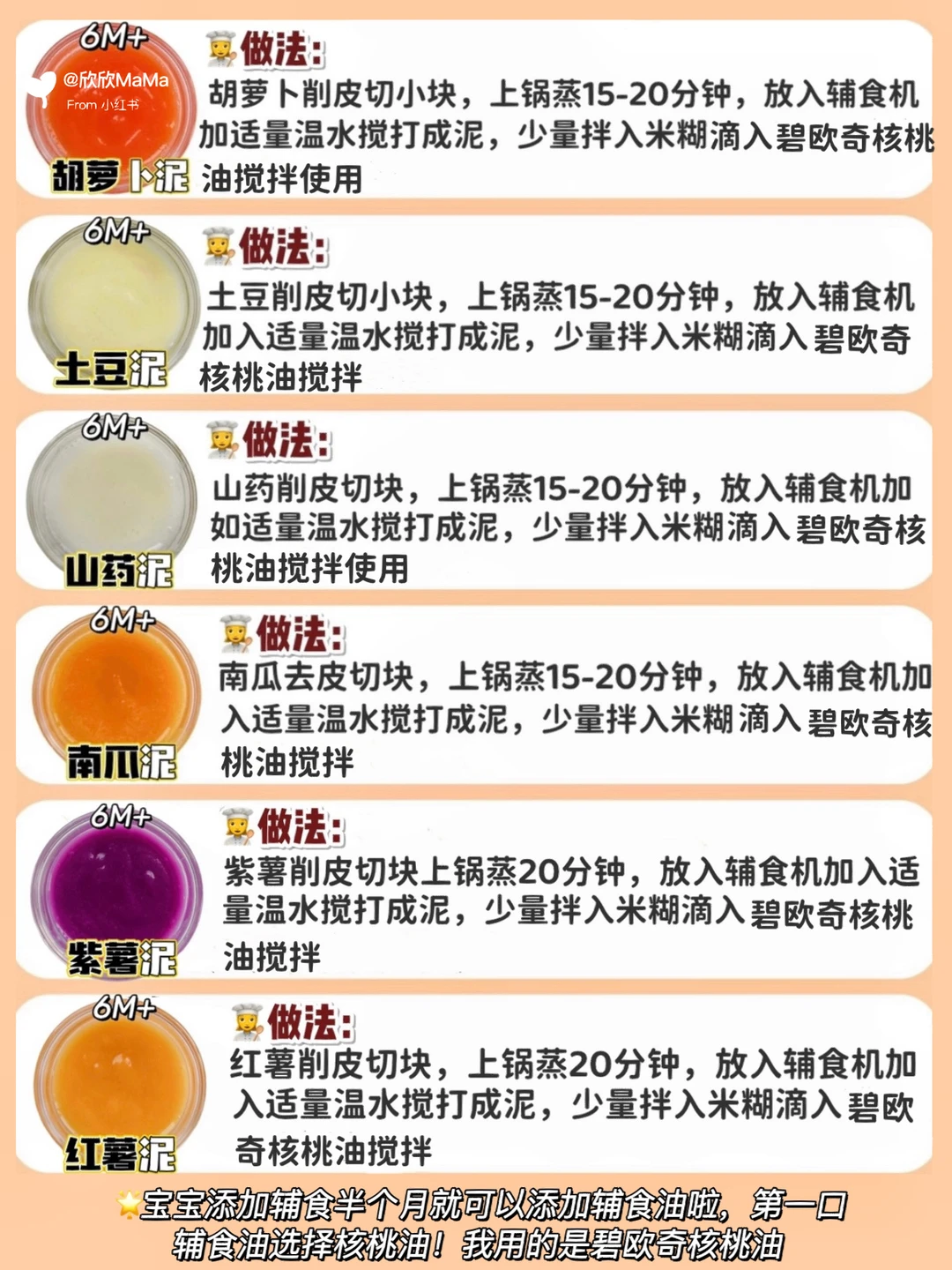 6月龄的宝宝就可以添加辅食了!是不是很多新手爸妈还比较疑惑辅食泥应该怎么添加?做法是怎么样的?那么欣欣妈今天跟大家分享下30款常见辅食泥的做法,记得收藏起来呀! . 🔻米粉冲泡方法 宝宝第一口辅食应该选择高铁米粉 米粉冲泡步骤: 先倒50-60度温水到碗中,加入适量米粉, 静待30秒,用勺子顺时针搅拌均匀 . 🔻添加辅食顺序 宝宝适应高铁米粉一周后,就可以在辅食里添加蔬菜泥拉.刚开始从根茎泥开始,添加辅食2周后就可以添加辅食油啦! . ⚠️ 每添加一种食材2-3天排敏期,如辅食泥第一天1-2勺,第2天2-3勺逐渐增加拌入米粉里滴入辅食油搅拌食用 . 宝宝辅食多样性后,我给小欣欣入手的是碧欧奇有机辅食油三件套!在配方还是工艺上,那都是有讲究哒!平时我都交替给宝宝使用,营养更全面. 🧡碧欧奇核桃油 宝宝初添加我建议从核桃油开始,它口感清淡,吃起来有淡淡的核桃香,平时我做辅食我都会用上,宝宝爱吃! 🧡碧欧奇紫苏籽油 它是目前植物中a-亚麻酸含量比较突出的一种辅食油,适合宝宝烹饪凉拌的油. 它的a亚麻酸高达67%,可以和核桃油交替吃 🧡碧欧奇亚麻籽油 它烟点231度,可以凉拌也可以热炒,并且油脂纯无苦味,宝宝容易接受 三款油的味道都很清淡,宝宝接受度高,满足各个辅食阶段,搭配吃营养更均衡,100ml小罐装短时间内能吃完,保证油脂新鲜! . 🔻根茎泥 🕒:吃米粉一周后开始添加 🛒食材:胡萝卜、土豆、 👩‍🍳做法:食材洗净削皮切小块,上蒸锅蒸20分钟,加入适量温水辅食机打泥少量拌入米糊滴入碧欧奇核桃油 . 🔻蔬菜泥 🕒:吃3-4种根茎泥后 🛒食材:西兰花、生菜 👩‍🍳做法:食材先用盐水浸泡十分钟,用清水反复清洗,水开放入锅中煮熟,加适量温水辅食机搅打呈泥少量拌入米粉里滴入碧欧奇紫苏籽油 . 🔻水果泥 🕑:添加辅食半个月后,安排在午睡后吃 🛒食材:苹果、香蕉、 👩‍🍳做法:直接刮泥勺刮出泥或削皮切块辅食机搅打呈泥 . 🔻鱼肉泥 🕐:7-8月逐渐增加 🛒食材:鸡肉、猪肉、 👩‍🍳做法:食材洗净用生姜水浸泡十分钟去腥,锅中焯水去浮沫冲洗几遍,上蒸锅蒸20分钟加适量温水辅食机搅打呈泥少量拌入米粉里 .