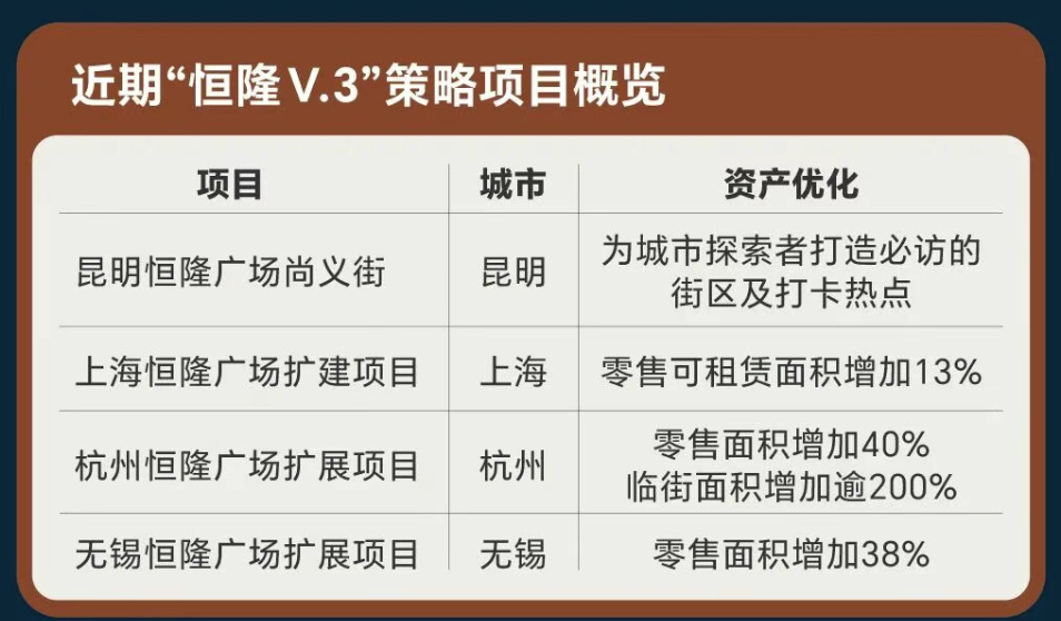 在恒隆地产体系内,目前已纳入“恒隆V.3”战略实施范畴的项目涉及昆明恒隆广场尚义街、上海恒隆广场、杭州恒隆广场、无锡恒隆广场。除杭州项目尚未开业外,其余项目均处于稳定经营状态。