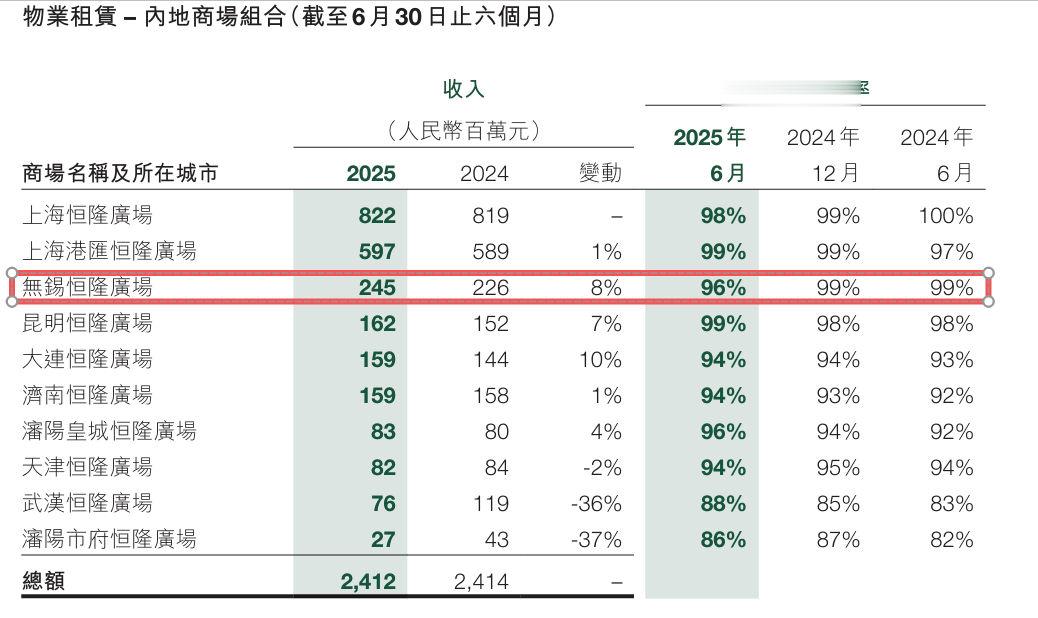 相比之下,此次空间扩容的无锡恒隆广场,于今年上半年实现收入2.45亿元。这一表现在恒隆地产内地商场中排在第三位。截至中期,项目出租率为96%,接近满租状态。