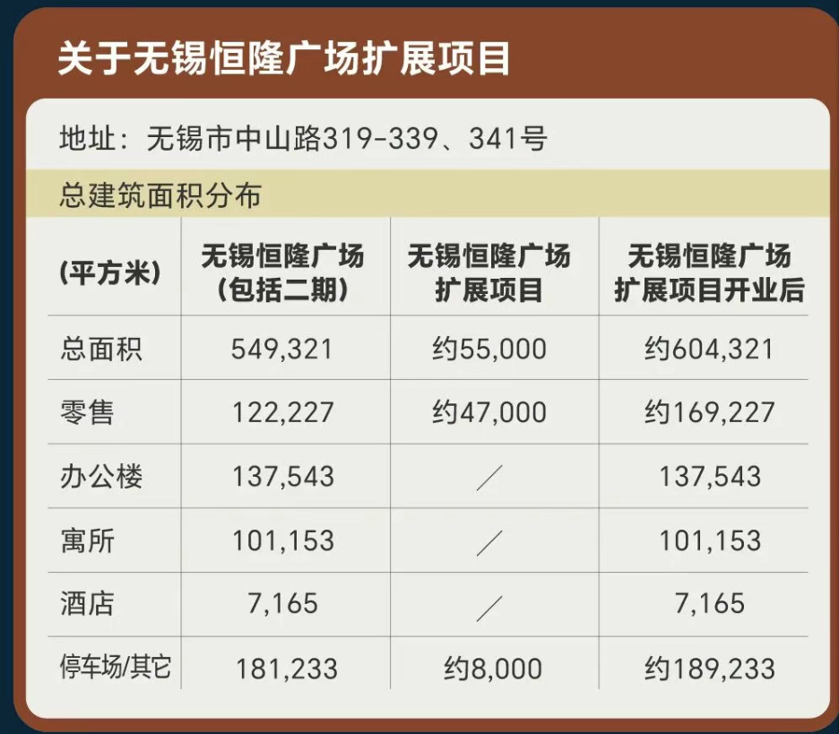 项目前身为无锡新世界百货(后改为华光珠宝城商厦),开业后将为无锡恒隆广场新增约4.7万平方米的商业空间,令其总零售面积扩大38%至约16.9万平方米。
