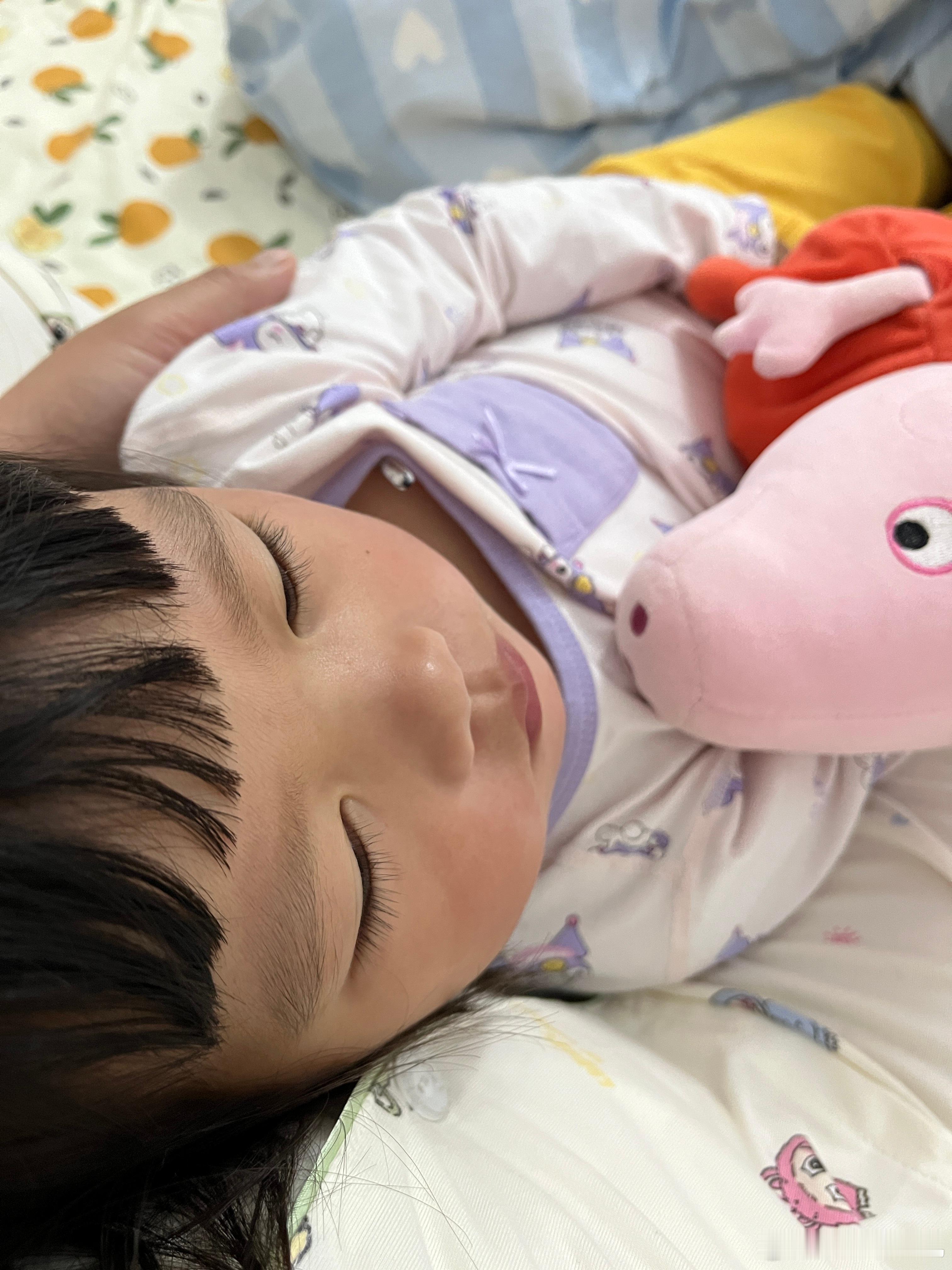 昨晚发烧了,直接烧到39.5,赶紧给她喝退烧药,因为她整个人都不舒服,转来转去,睡不着。喝退烧药的时候,整个人在发抖,她害怕,我说喝下去就好,她说不要,吓得哭起来,然后说喝完给手机看5分钟,她才敢喝下去,喝了之后发现并不可怕,说还要喝,我说这是药,不能多喝的。又长大了,虽然她很难受,但是她后面睡觉,整夜都没有哭闹,哪里不舒服,就和我说,要我抱她睡觉,烧得太热,全身烫烫的,让我给她换了薄的衣服。和老师请假,说今天不去上学,不舒服,还在低烧。