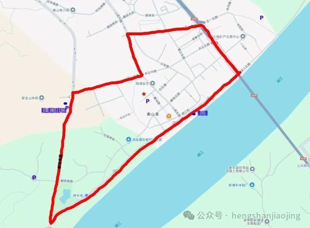 “衡山渡”牌坊(原水利局)→衡山渡(滨江北路)→桥盛街→衡山大道辅道(桥头)→五一中路→人民中路→开云南路→紫巾路→毛泽建公园→滨江南路→“衡山渡”牌坊(原水利局)