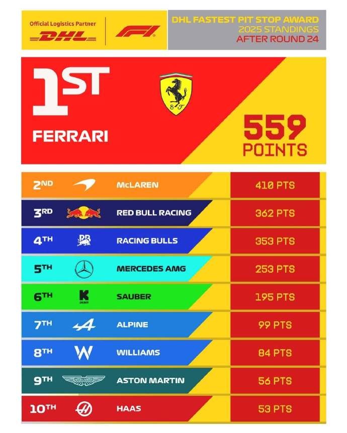 直播吧12月11日讯2025赛季F1落下帷幕,据F1官方统计,法拉利车队以559分夺得最快换胎奖,迈凯伦410分第二,红牛362分第三。