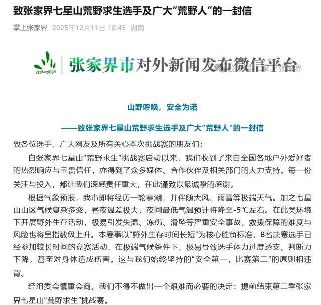 12月11日,张家界七星山“荒野求生”挑战赛组委会发布《致张家界七星山荒野求生选手及广大“荒野人”的一封信》,宣布因极端天气原因,提前结束第二季张家界七星山“荒野求生”挑战赛。