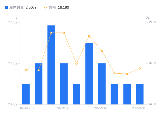 日期A股户数(户)流通A股户均持股数(股)户均持股市值(万元)2025-12-10250009901.2316.032025-11-28250009901.2315.702025-11-20250009901.2315.742025-11-10260009520.4116.432025-10-31270009167.8016.662025-10-20250009901.2316.332025-10-10260009520.4117.492025-09-30278508888.0016.332025-09-20260009528.5315.322025-09-10250009909.6715.97