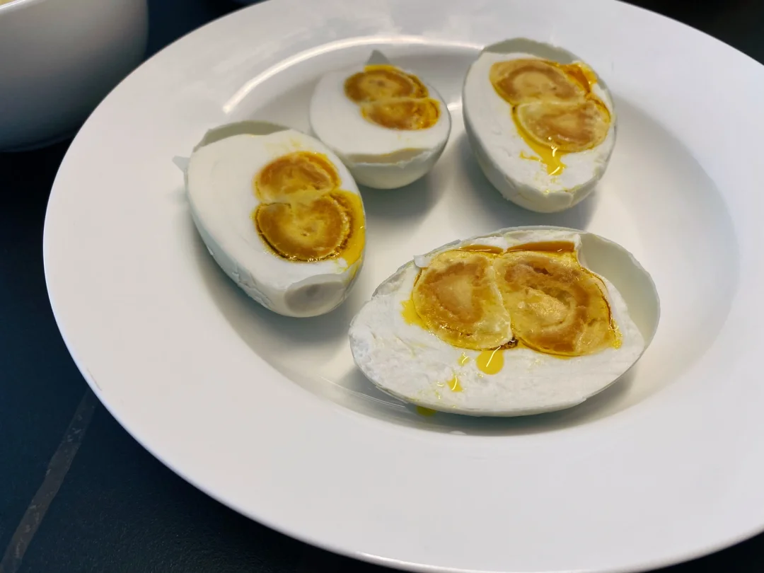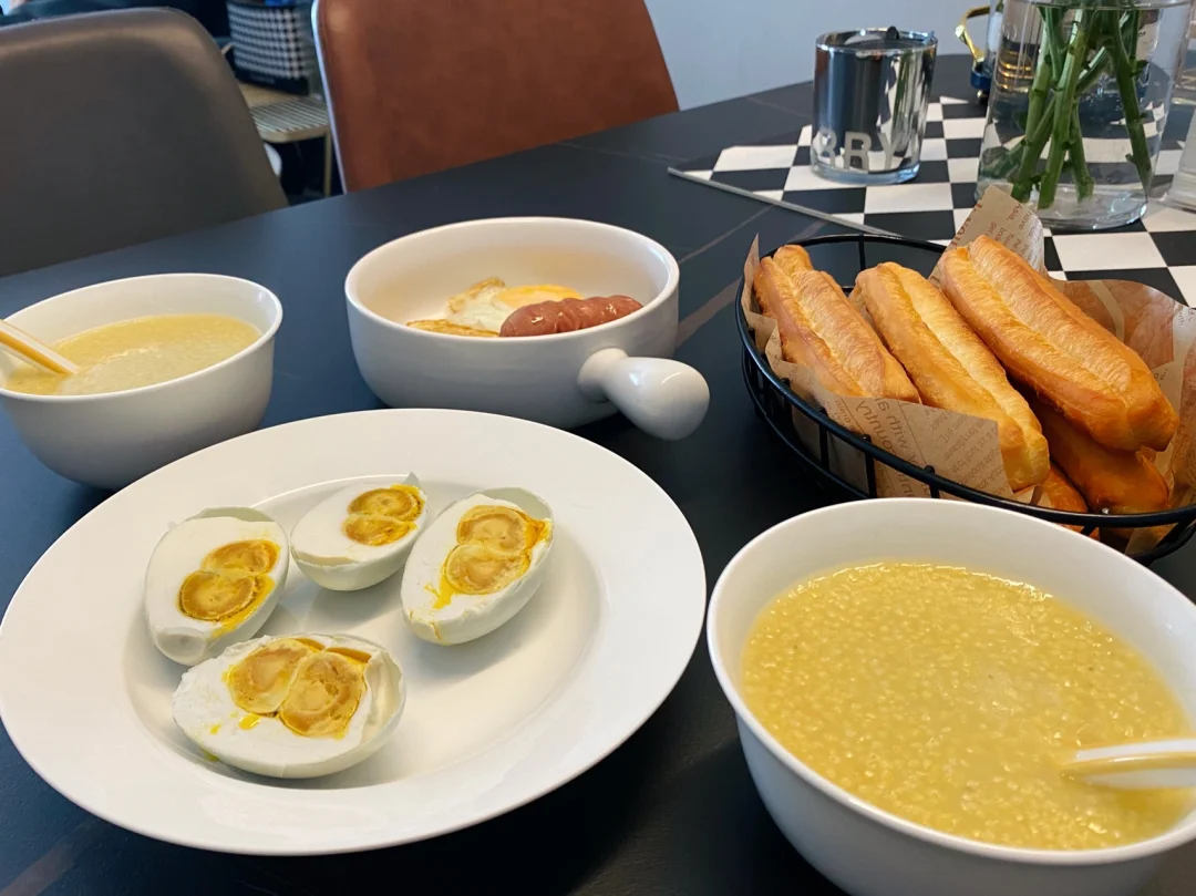 今天的早饭有油条,小米粥,烤肠,煎蛋,还有这个会流油的双黄咸鸭蛋可真不错~