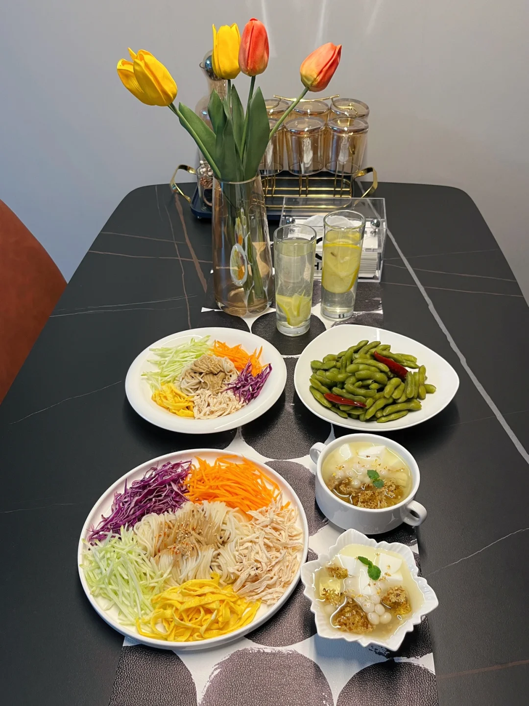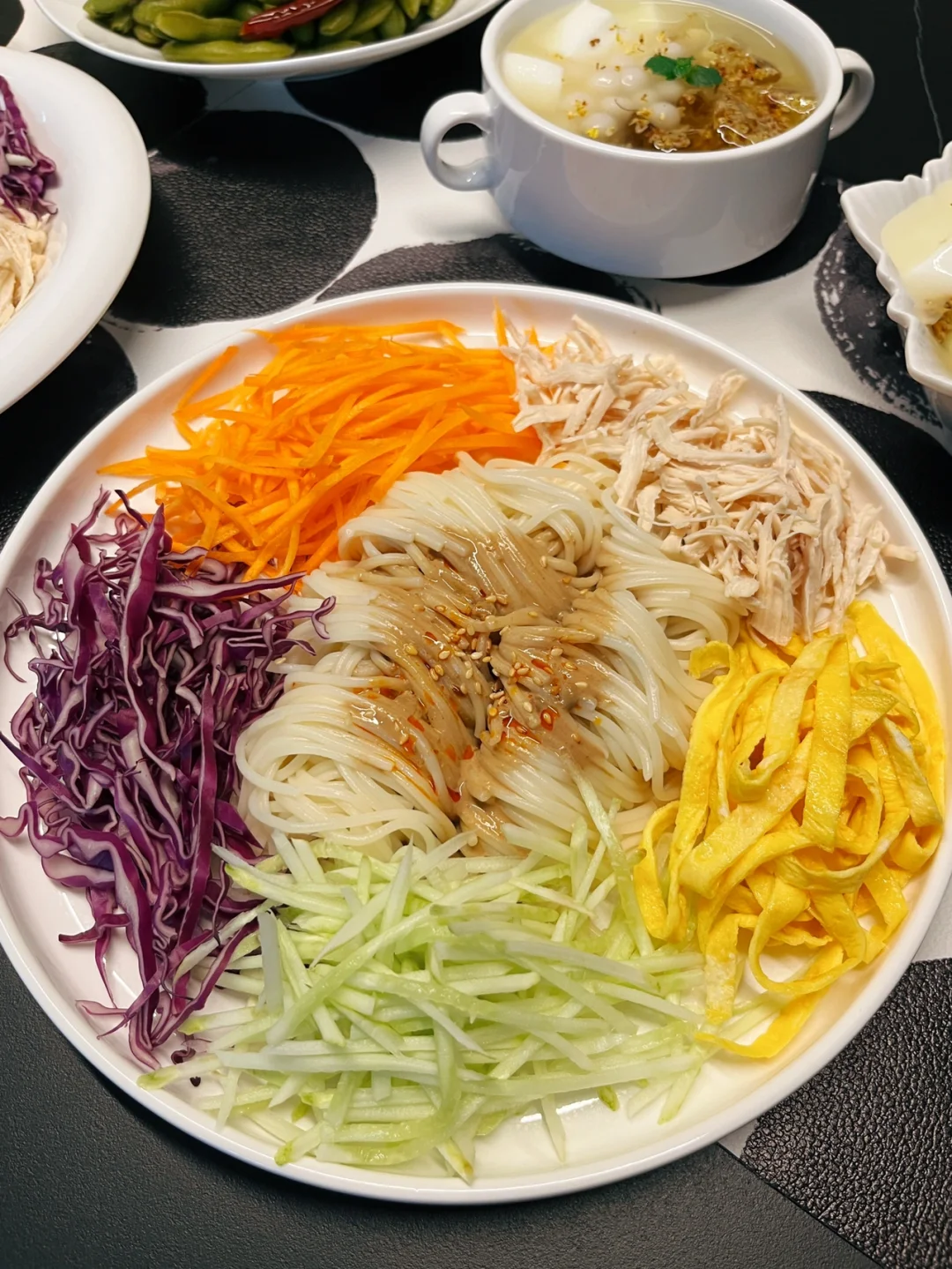 开饭啦🥢(附教程): 🌈鸡丝凉面 🌈卤水煮毛豆 🌈桂花椰奶冰粉 🌈柠檬蜂蜜水 面食爱好者千万不要错过这份鸡丝麻酱凉面~
