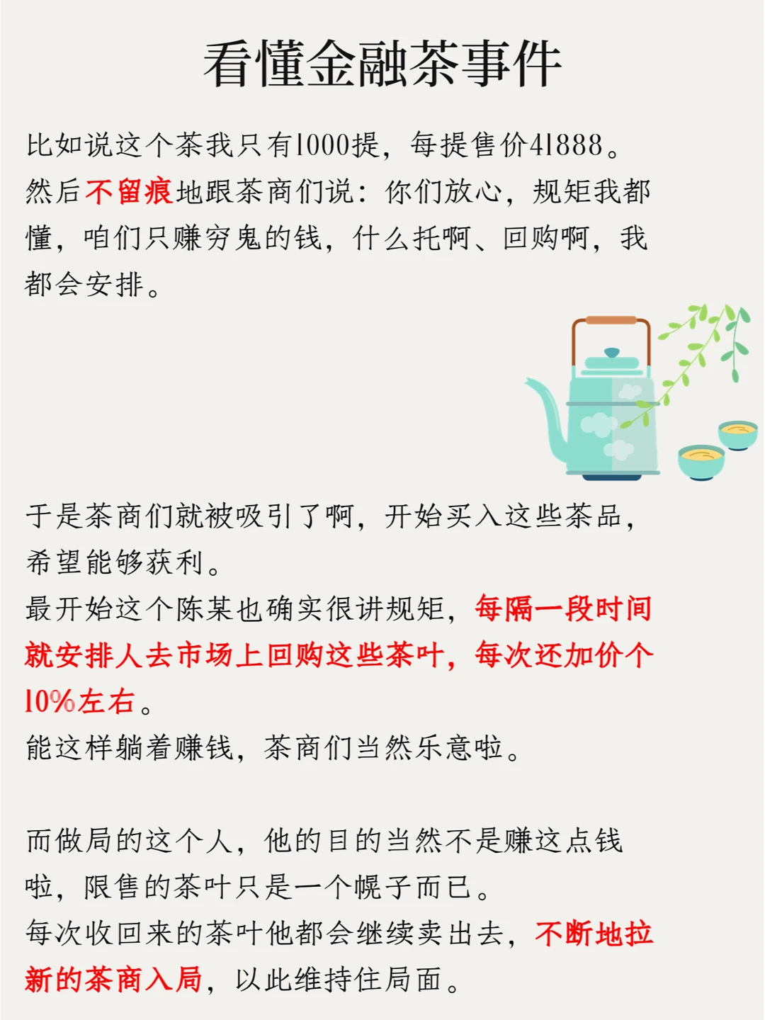 于是茶商们就被吸引了啊,开始买入这些茶品,希望能够获利。最开始这个陈某也确实很讲规矩,每隔一段时间就安排人去市场上回购这些茶叶,每次还加价个10%左右。