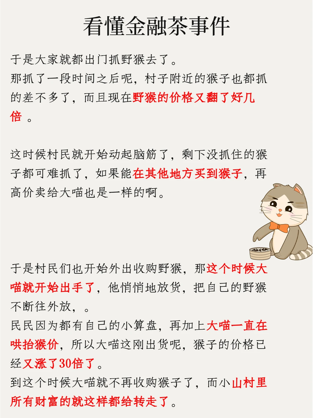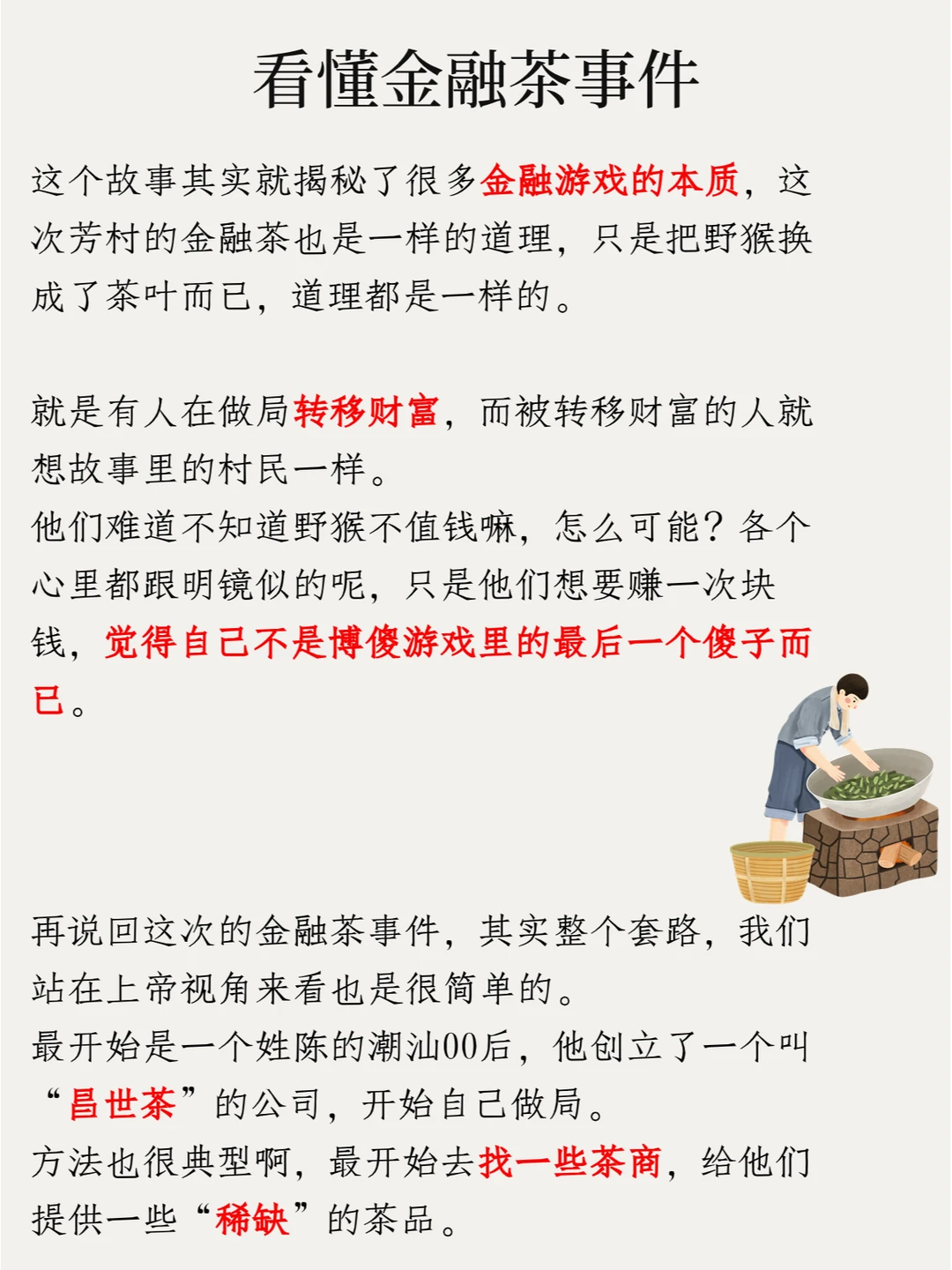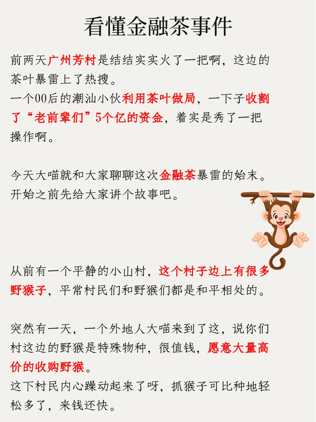 这个故事其实就揭秘了很多金融游戏的本质,这次芳村的金融茶也是一样的道理,只是把野猴换成了茶叶而已,道理都是一样的。