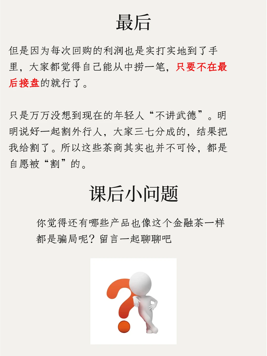 就是有人在做局转移财富,而被转移财富的人就想故事里的村民一样,他们难道不知道野猴不值钱嘛,怎么可能?各个心里都跟明镜似的呢,只是他们想要赚一次块钱,觉得自己不是博傻游戏里的最后一个傻子而已。