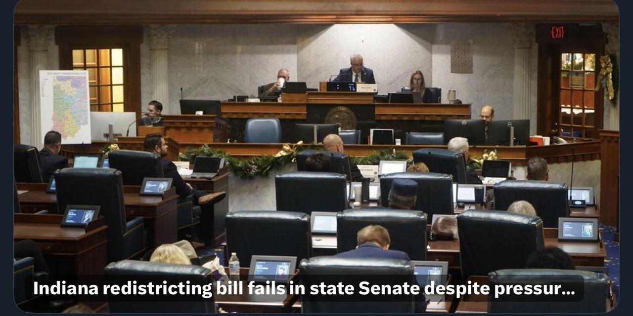 共和党遭遇挫败 尽管特朗普几个月的压力,但印第安纳州参议院否决了共和党人重新划分选区法案,该方案将新增两个共和党国会席位。 印第安纳州参议院共和党人未能通过一项重新划分选区法案,该法案本可以击败该州的两名众议院民主党人,尽管特朗普政府几个月的压力,而且州参议员面临炸弹和抨击威胁。 最终投票是19名参议员赞成,39名反对。共和党在州参议院有40个席位,民主党有10个席位。意味着有29个共和党人投下反对票。 周四的失败标志着自特朗普在夏天启动重新绘制国会地图以来,全国共和党人重新划分选区计划首次被挫败。 印第安纳州共和党州长支持重新划分选区的迈克·布劳恩在社交媒体上发帖称,他对结果“感到失望”,并表示他将“与总统合作,挑战这些不代表胡斯最佳利益的人。” 特朗普发誓要支持对投票反对印第安纳州措施的共和党人的初选挑战,并于周三针对参议院临时议长罗德里克·布雷。 特朗普在投票前在社交媒体上发帖说:“我相信,任何投票反对重新划分选区和共和党在华盛顿特区的成功的人,都会在春季参加MAGA初选。”“Rod Bray和他的朋友们在政坛上不会太久,我会尽我所能确保他们不会再伤害共和党和我们的国家。” 当州参议院辩论投票时,副总统万斯在社交媒体上发帖说,Bray“一直告诉我们,他不会反对重新划分选区,同时鞭打他的成员反对它。这种程度的不诚实是无法得到奖励的,印第安纳州共和党需要选择一方。” 共和党州参议员Spencer Deery说:“我和你们中的超级多数人一样,不想看到另一位民主党众议院议长。”他反对重新划分选区。“但那不是由我来决定的,也不是由这个身体里的任何人来决定的。生活在一个自由的宪政共和国中意味着我们授权选民做出这些决定。”
