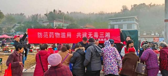 为进一步增强辖区群众禁毒意识,筑牢全民禁毒防线,12月11日上午,适逢乌石镇传统赶集日,人流密集。乌石镇禁毒办、司法所、派出所、团委紧密联动,精心组织,巧妙利用这一契机,在集镇繁华路段联合开展了一场以“防范药物滥用,共建无毒三湘”为主题的禁毒宣传活动,将禁毒知识送到群众身边。